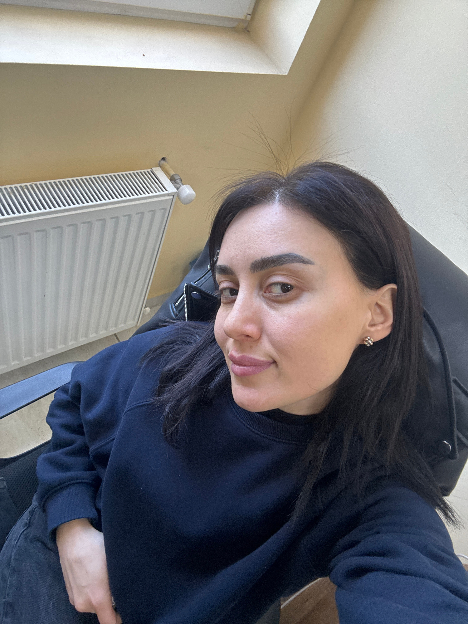 A woman with dark hair and eyebrows, wearing a dark blue sweatshirt, is pictured in an indoor setting. She is seated in a black office chair. Beside her is a white radiator. The wall is painted a ligh…read more