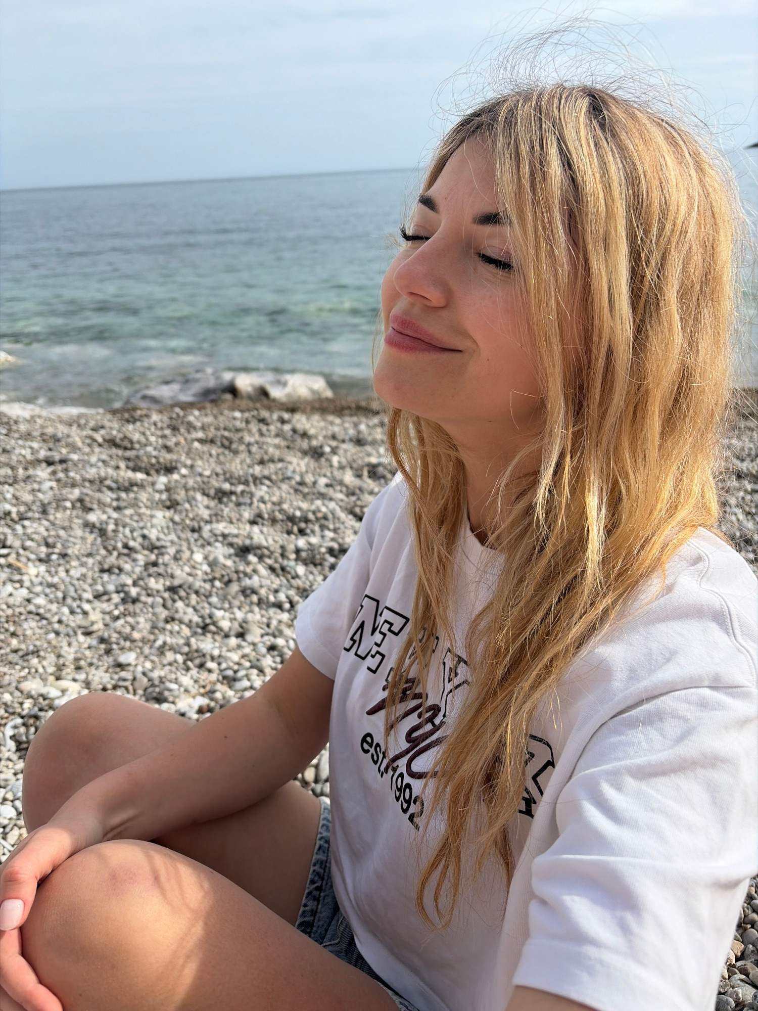 A woman is crouched on a pebble beach in Prijevor, Montenegro. She is wearing a white t-shirt and denim shorts. The sea is visible in the background, along with the sky. The woman appears to be lookin…read more