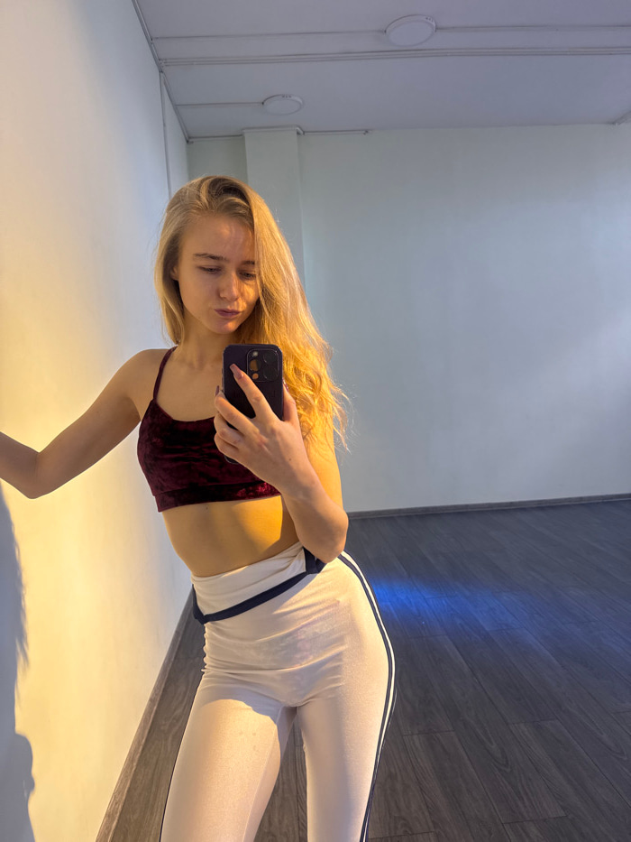 The subject, a young Caucasian female, is depicted indoors within what appears to be a dance studio or gymnasium, location Unknown, Unknown. She has long, wavy blonde hair and is wearing a dark red ve…read more