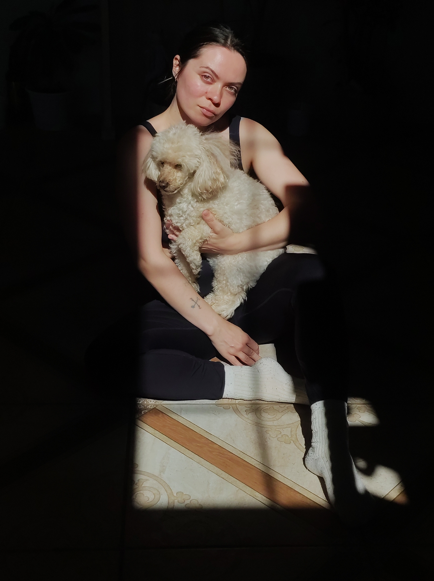 A young woman sits cross-legged, holding a small, white poodle dog in her arms. She is wearing a black tank top, dark leggings, and white socks. A tattoo is visible on her left forearm. The scene is s…read more