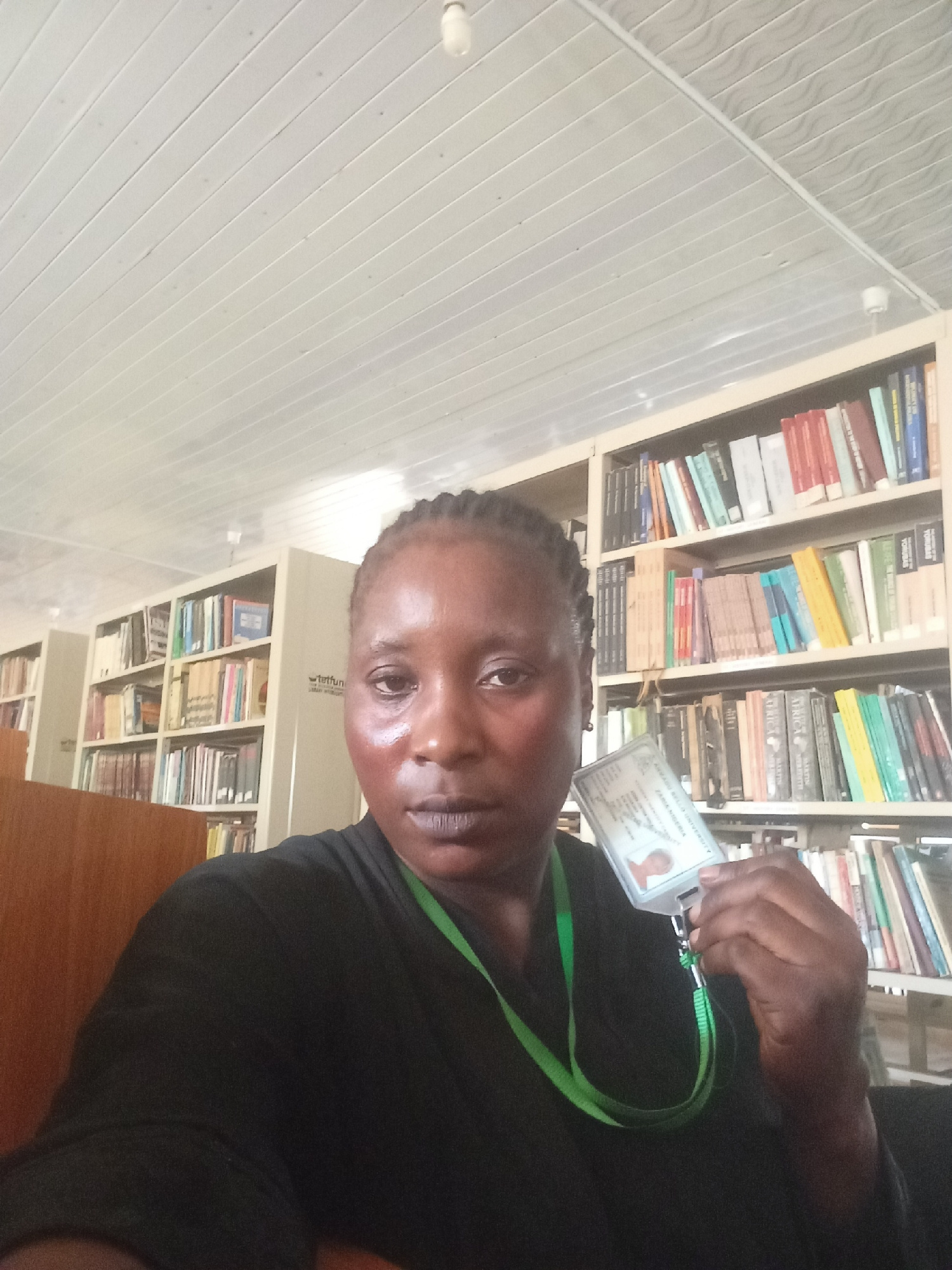 A woman is taking a selfie indoors, presumably in a library in Akwanga, Nigeria. She is holding up an identification card. The background shows multiple bookshelves filled with books. The ceiling has…read more