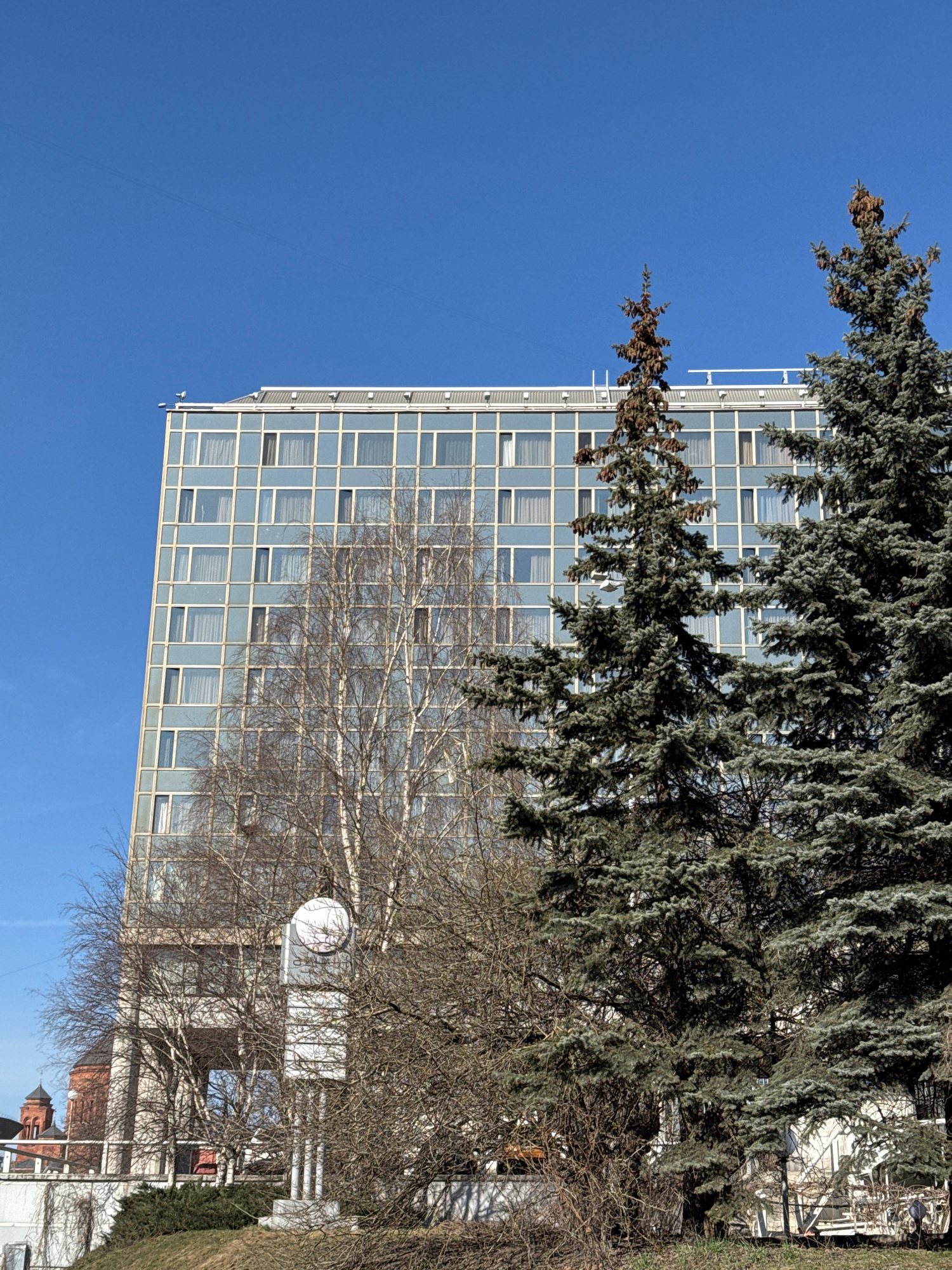 The image depicts a multi-story building with a grid-like facade of windows. The sky is clear and blue. Trees, some with green needles and others bare, frame the building. The location is identifiable…read more