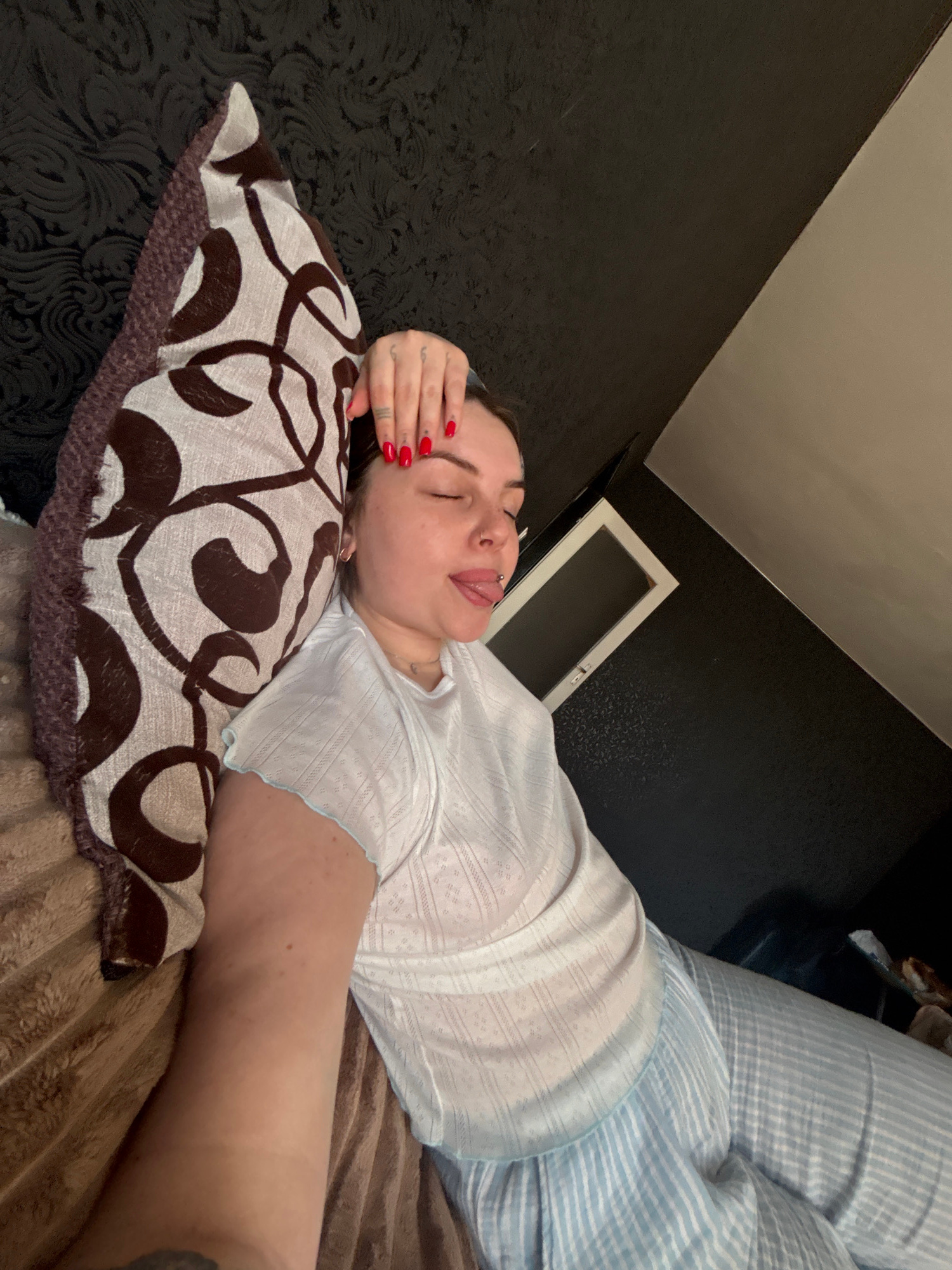 A woman is lying on a bed with a patterned pillow under her head. She is wearing a white, patterned shirt and light blue striped pajama pants. Her left hand rests on her forehead, and her nails are pa…read more