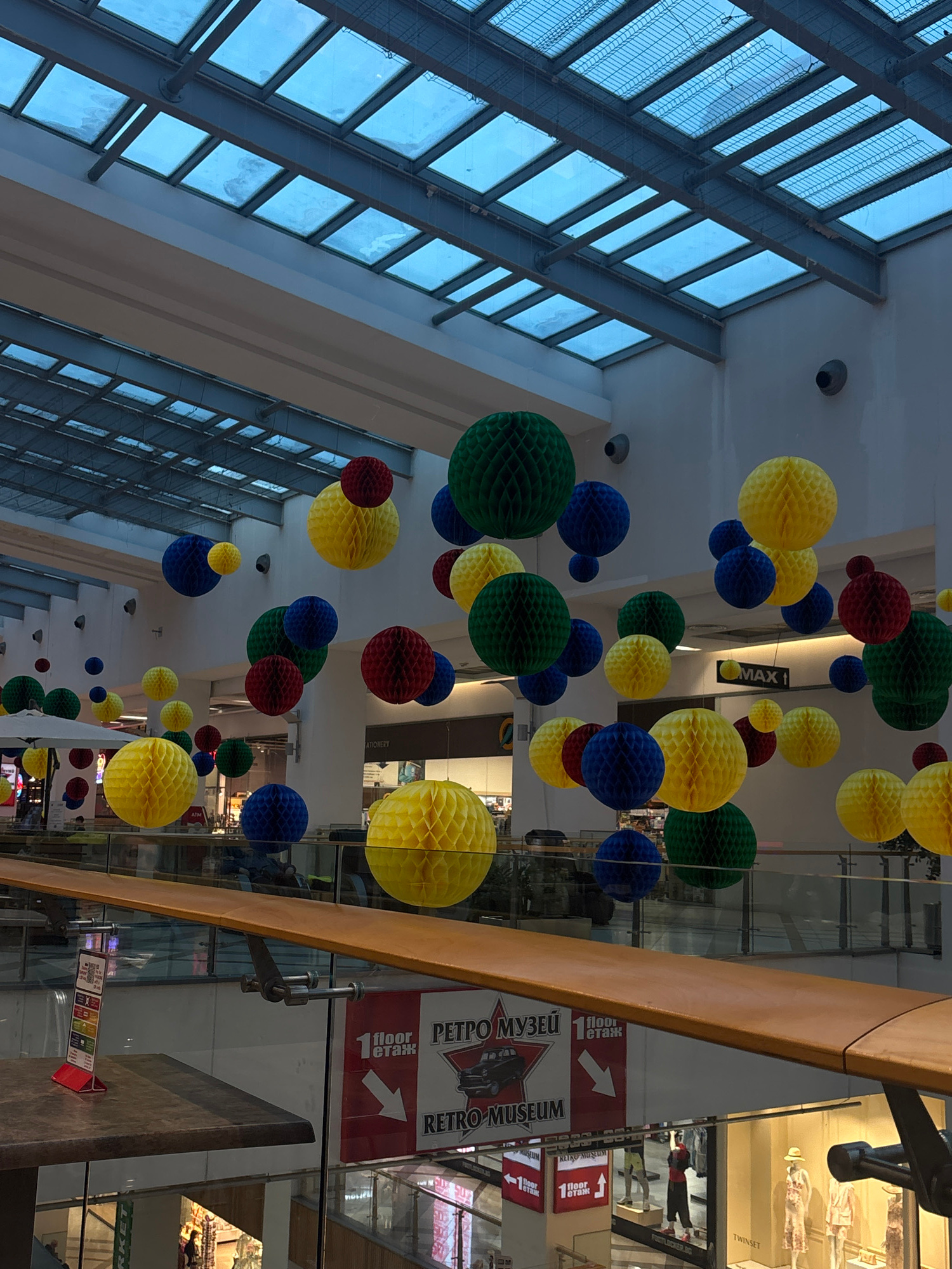 The image depicts an interior view of what appears to be a shopping mall in Varna, Bulgaria. Above, a ceiling composed of numerous rectangular windows framed by a grid of metal bars is visible, lettin…read more