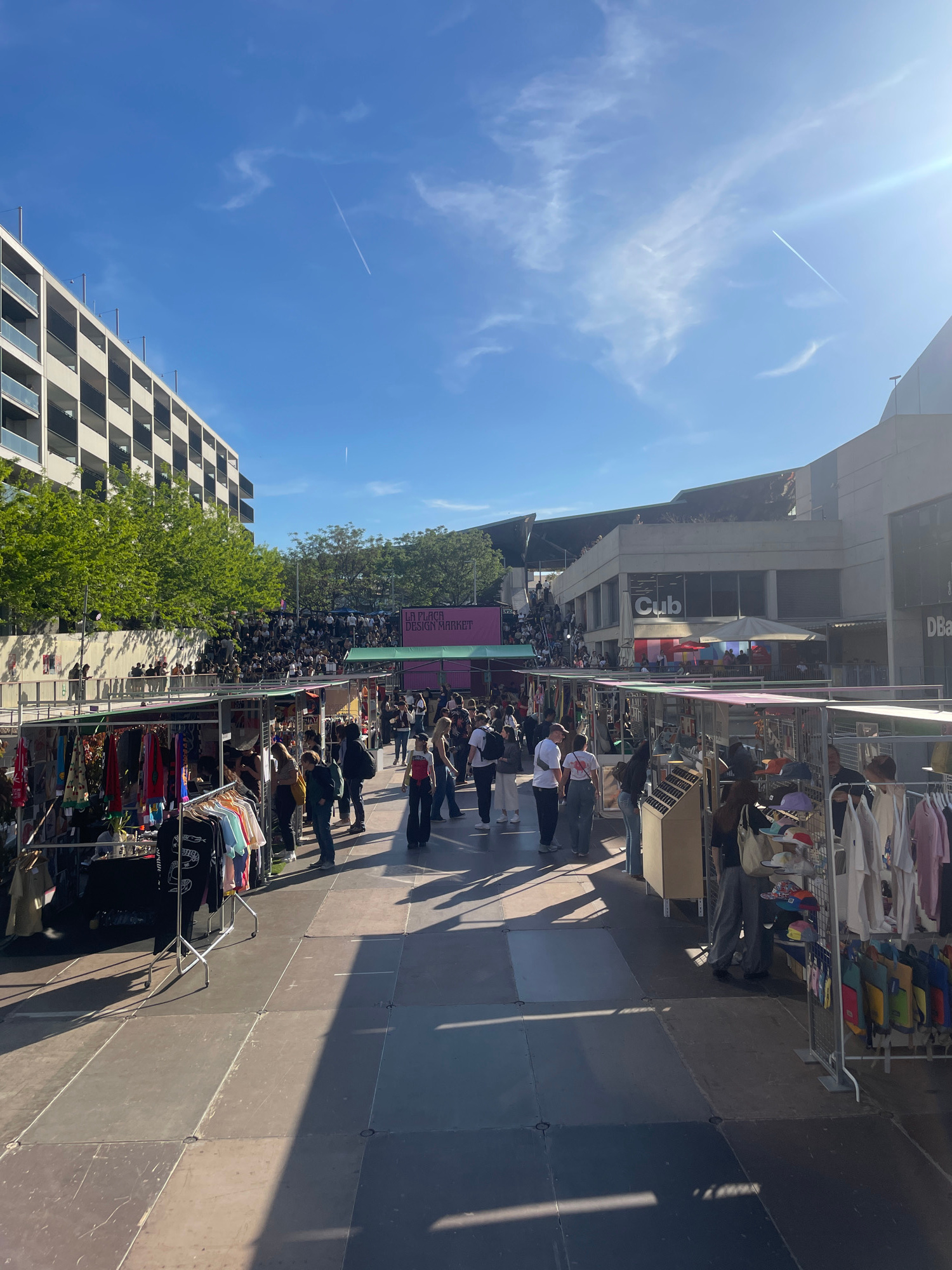 The image captures an outdoor market scene in Barcelona, Spain. A crowd of people is observed amidst vendor stalls displaying clothing and other goods. Buildings surround the market area. The sky is b…read more