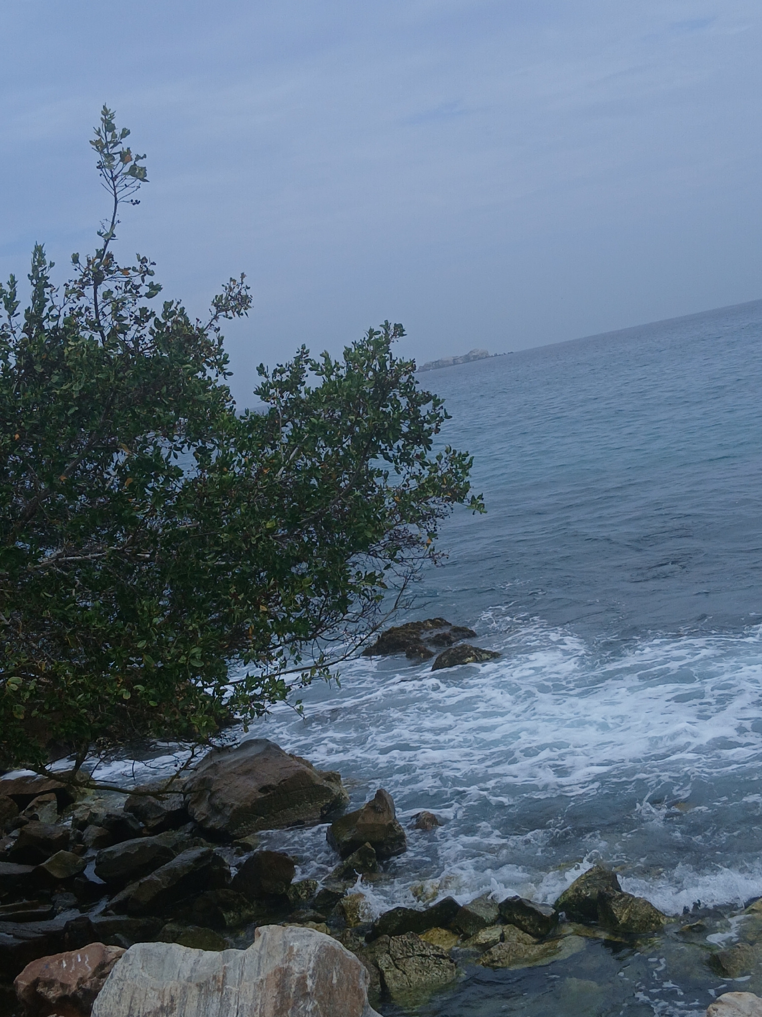 This media file captures a natural coastal scene in Pampatar, Venezuela, featuring the ocean, a rocky shoreline, and prominent vegetation under an overcast sky. The upper portion of the image is domi…read more