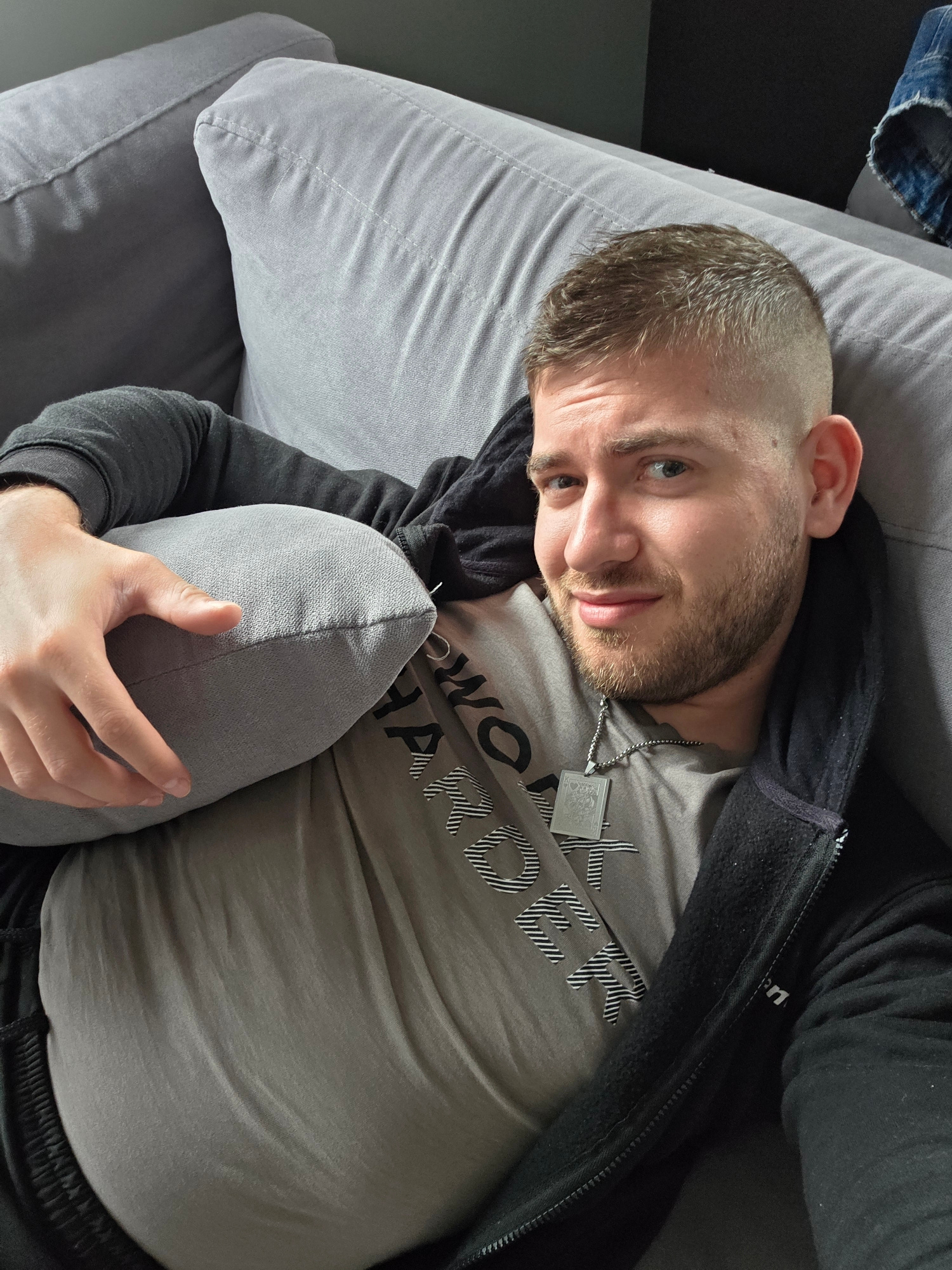 A man lies on a gray couch, facing the camera. He wears a gray t-shirt, a black zip-up jacket, and a silver necklace. He is holding a gray pillow. The background includes a gray wall and a glimpse of…read more