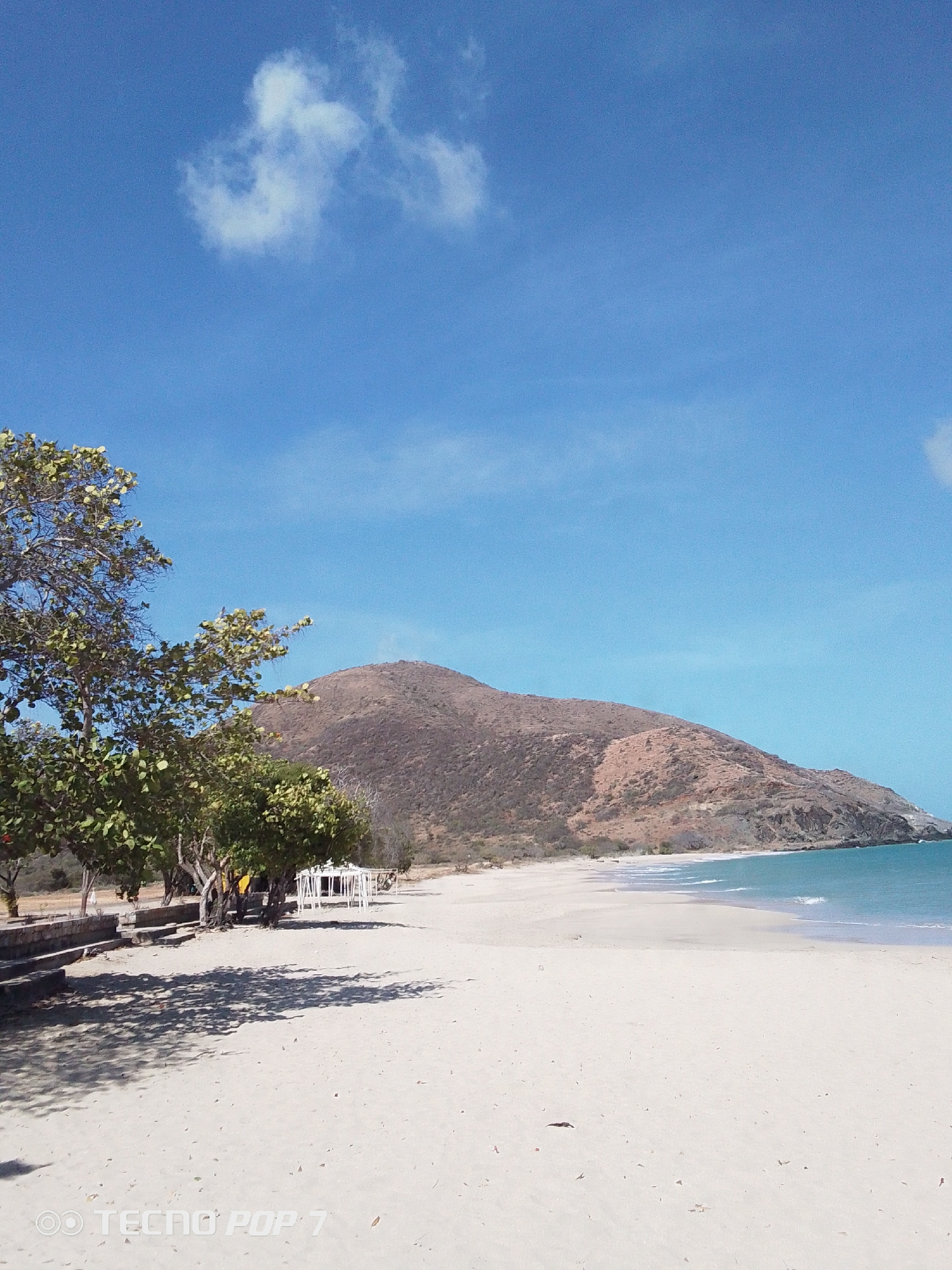 The image shows a beach scene in Pedro González, Venezuela. The foreground consists of a sandy beach with tree shadows and a few trees, with white structures that appear to be canopies. Beyond the bea…read more