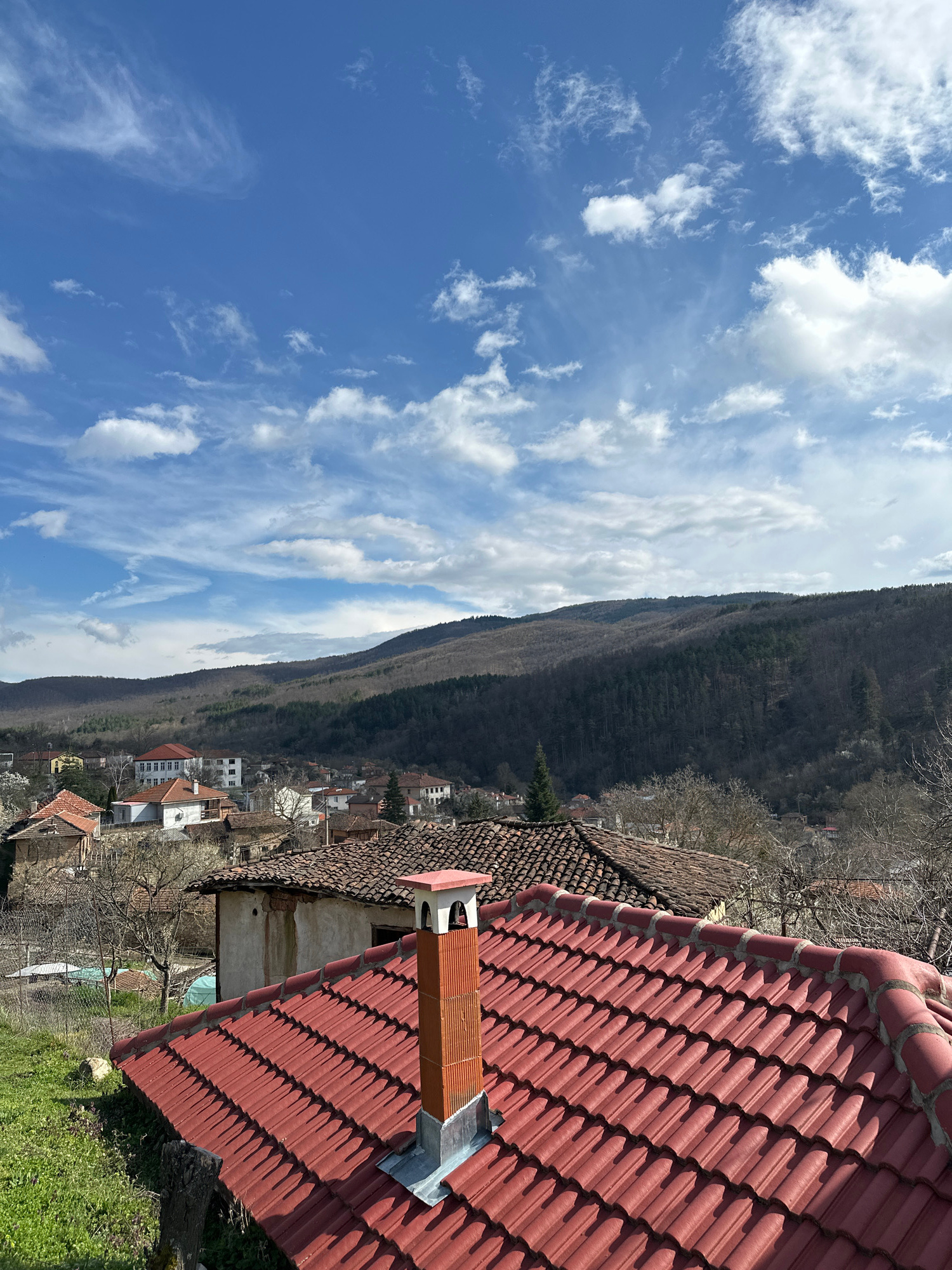 The scene, set in Mrachenik, Bulgaria, presents a high-angle view, potentially from a rooftop, capturing the landscape and parts of the village. A predominantly red tiled roof occupies the foreground,…read more