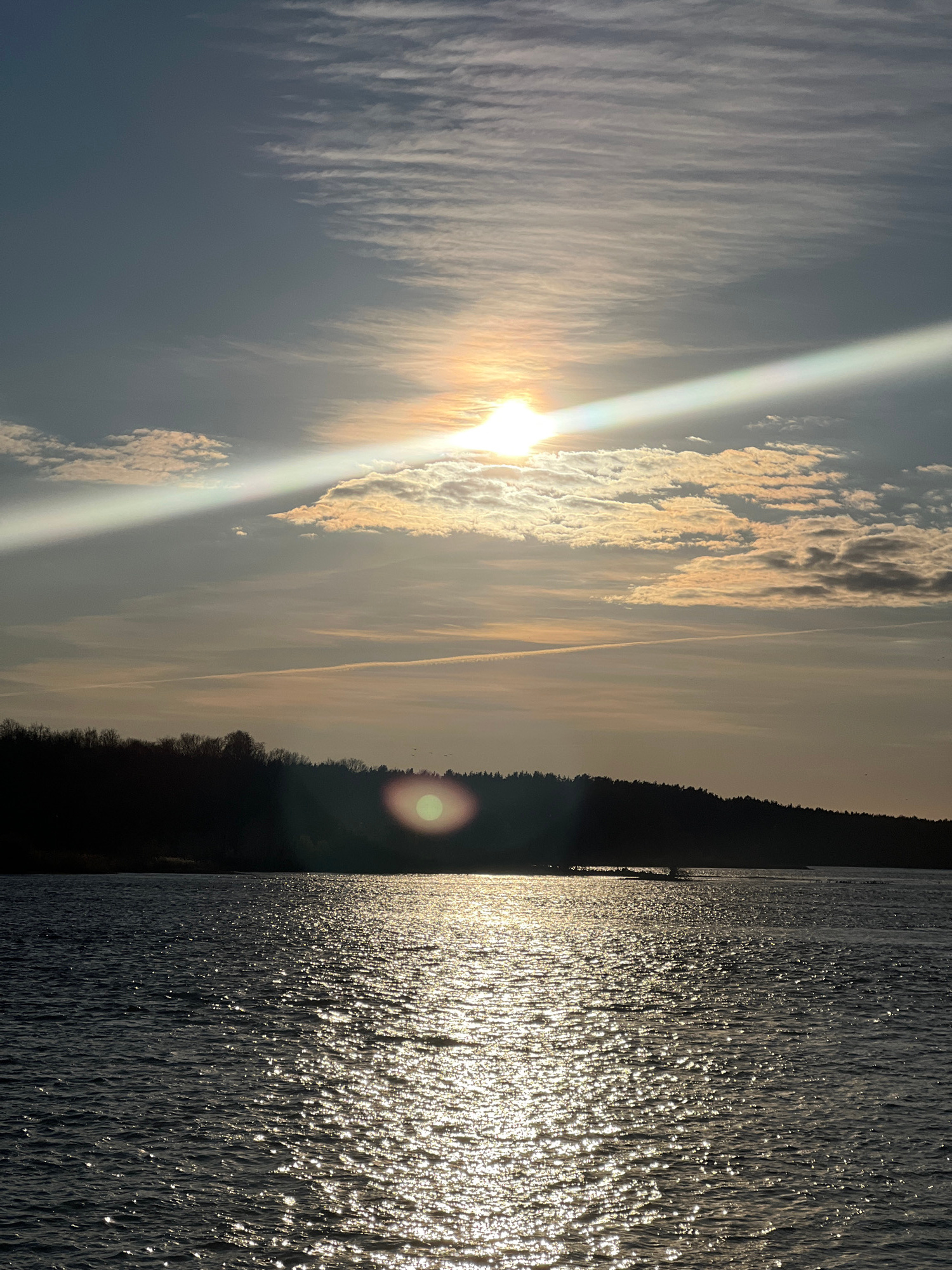 The image depicts a waterfront scene. The sun is bright and appears to be low in the sky, casting a strong reflection on the rippled water's surface. The sky features varied cloud formations, some den…read more
