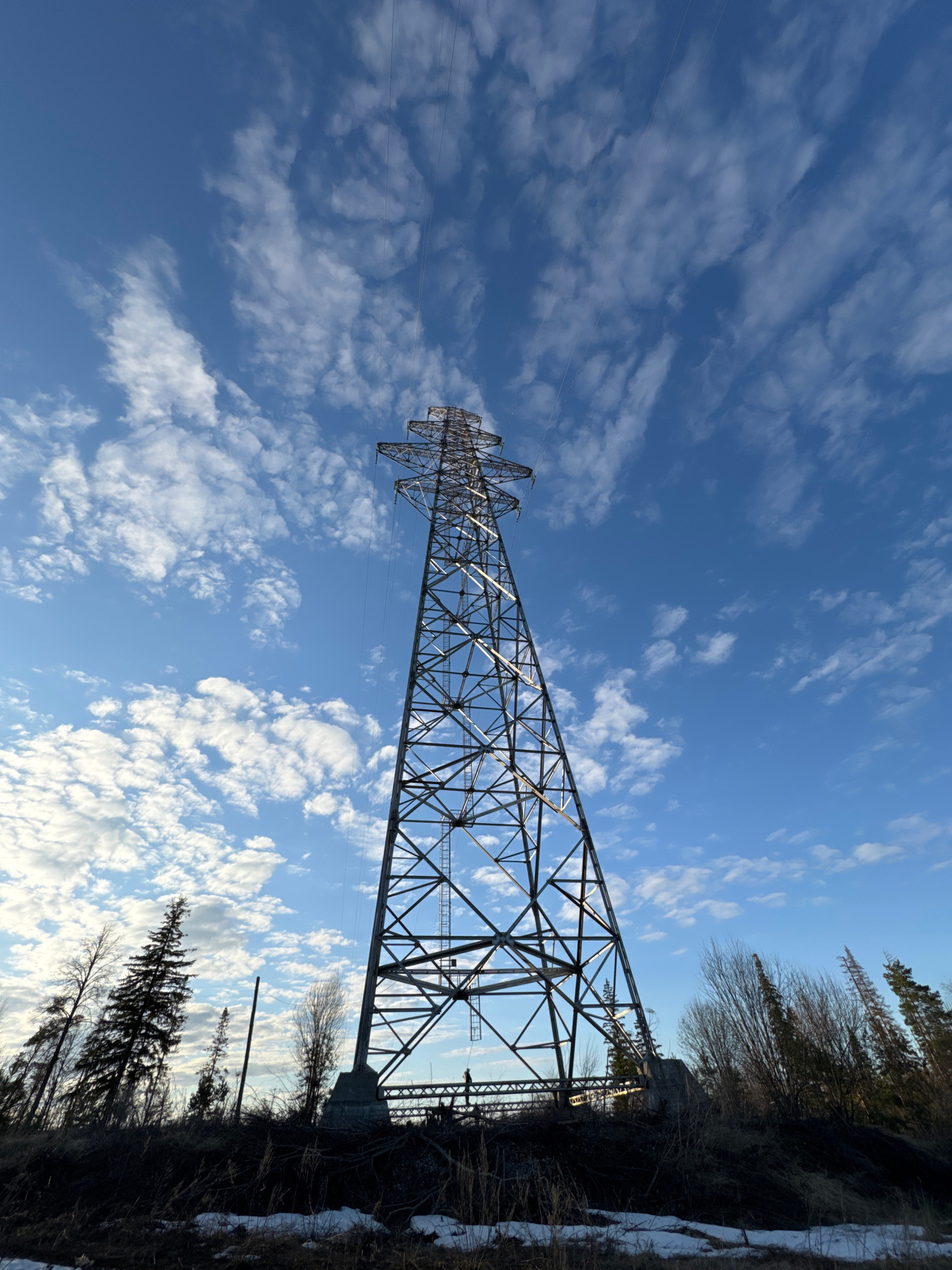 A low-angle shot looking up at a metal electric power transmission tower. The tower's lattice structure dominates the frame, extending across the sky. A bright blue sky filled with small white clouds…read more
