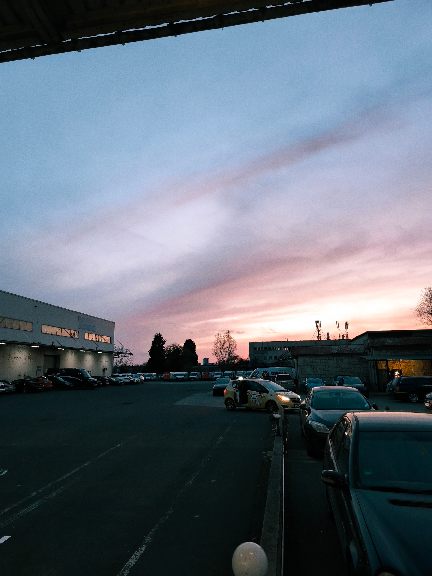 The image captures an outdoor parking lot or industrial area in Burgas, Bulgaria, during what appears to be twilight or sunset. The sky is a prominent feature, transitioning from a light blue at the t…read more