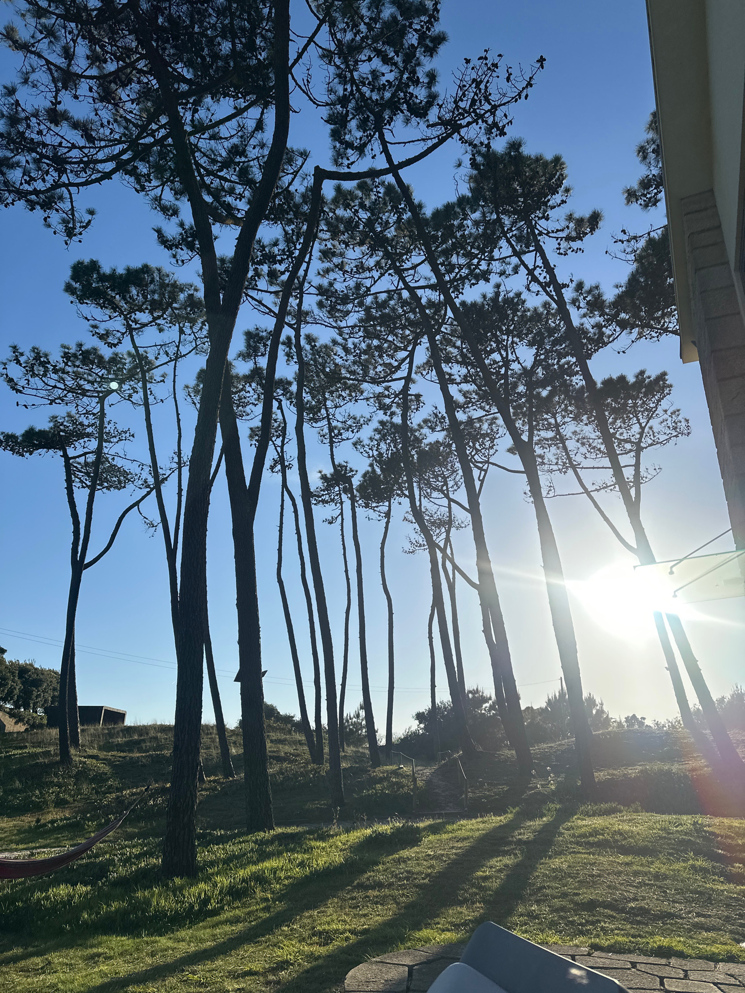 The image captures a scene in Esposende, Portugal, featuring tall, thin trees silhouetted against a bright, sunny sky. The trees are lined up in a row, stretching into the distance. On the right side…read more