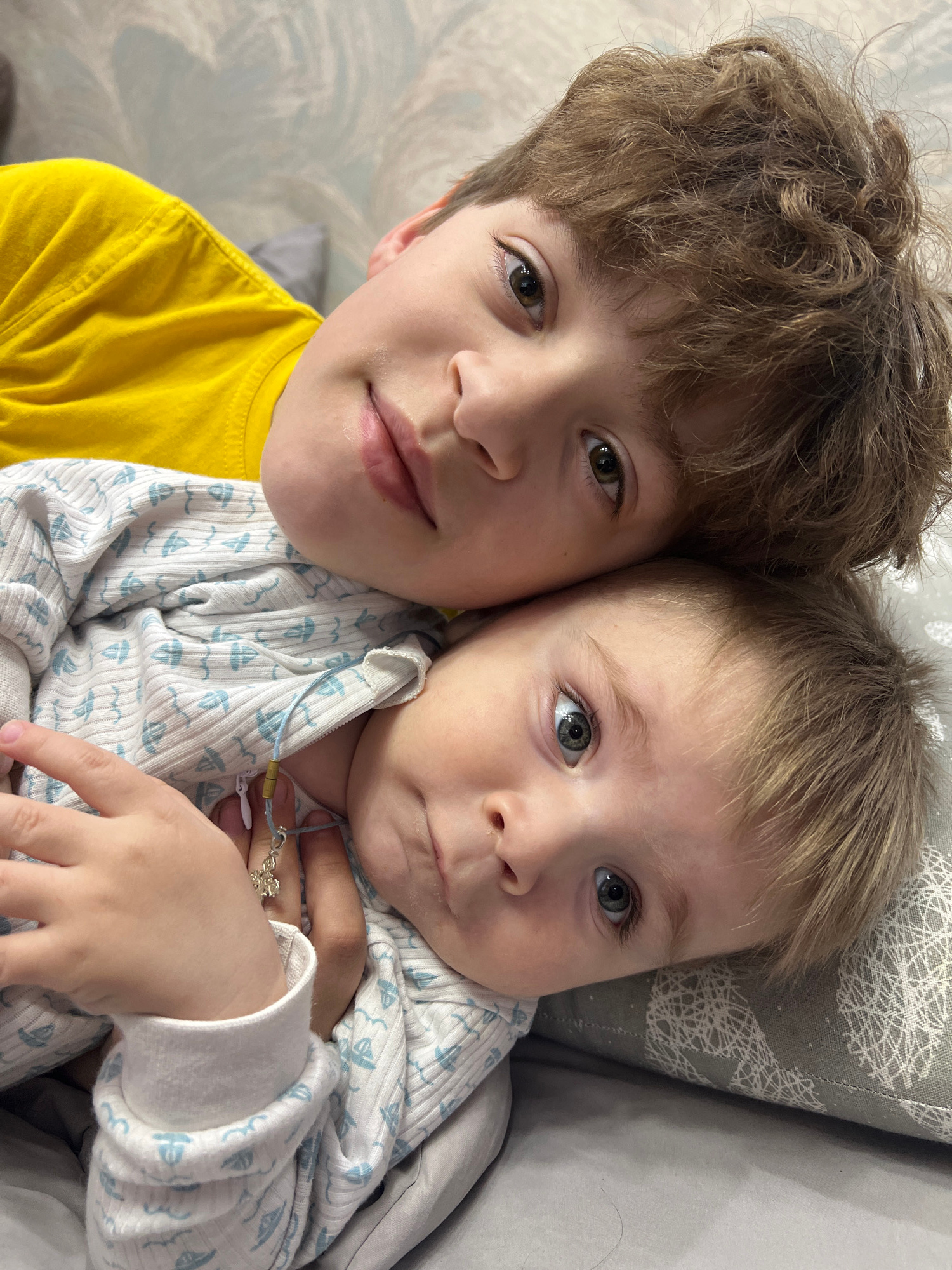 Two children are positioned close together indoors. The child on the left wears a bright yellow t-shirt and has curly brown hair. The child on the right wears a white and light blue patterned shirt. A…read more