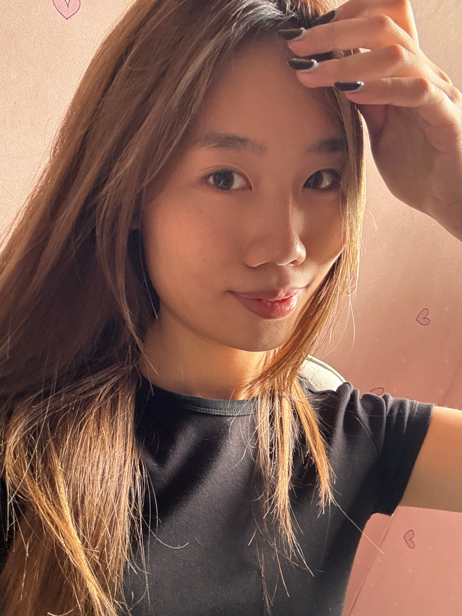 A woman with shoulder-length brown hair lies with her head tilted to the left, looking up at the camera. Her hand is raised near her head. She has dark nail polish on her fingernails. She is wearing a…read more