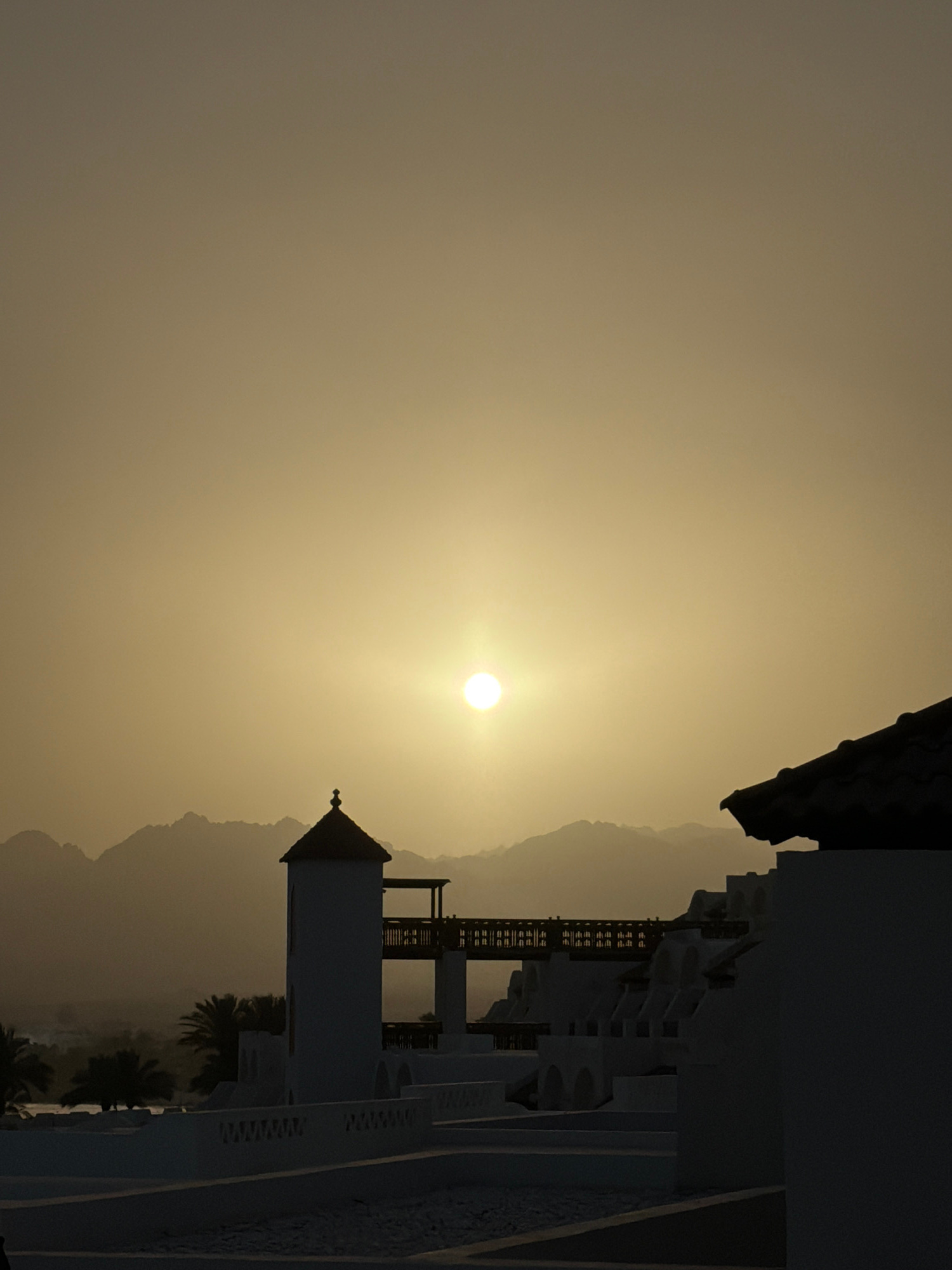 The image shows a sunset scene in what appears to be Sharm El Sheikh, Egypt. A bright sun is positioned in the sky, partially obscured by a golden haze. Silhouetted against the sky are mountains and a…read more