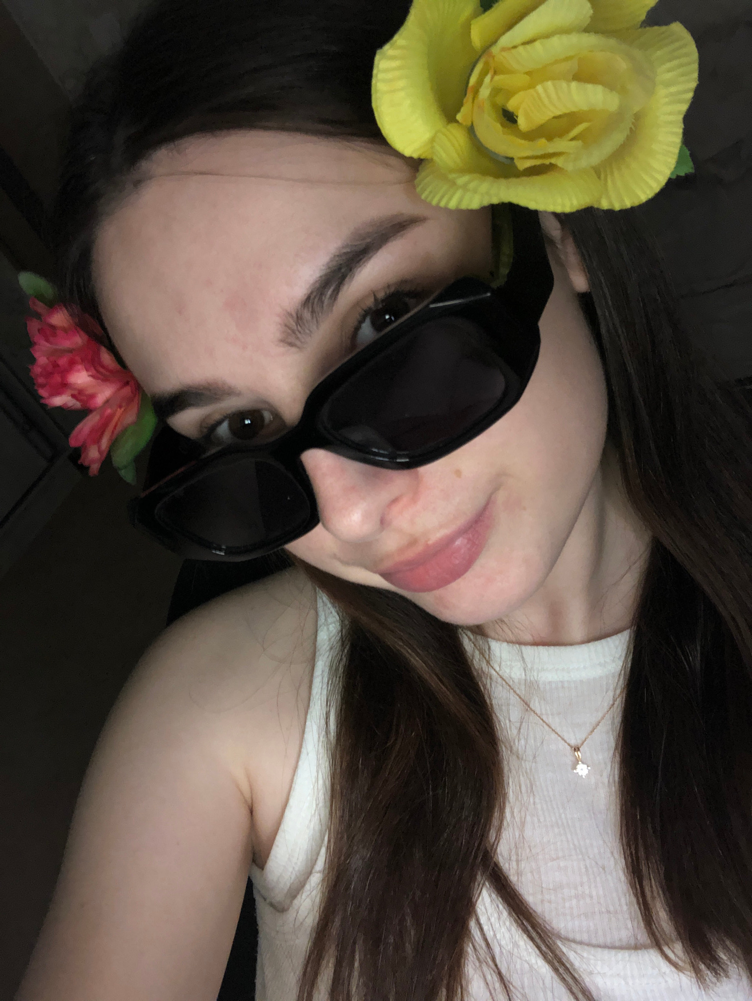 A young woman with long, dark brown hair is pictured from a high angle, lying down and looking up at the camera. She is wearing a white T-shirt and black sunglasses. A yellow flower is positioned nearβ¦read more