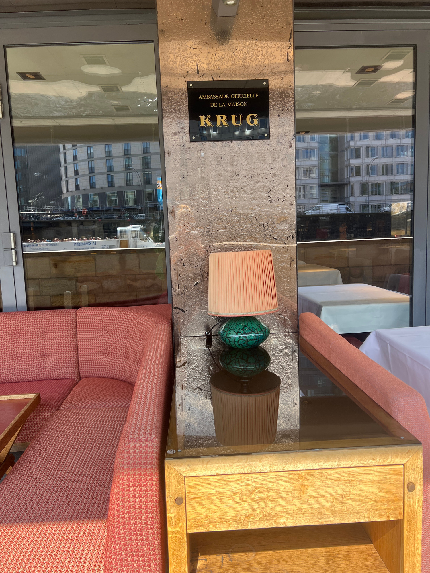 The image captures an interior view, likely of a restaurant, lounge, or private dining area in Berlin, Germany. The main subjects include a large, textured salmon-pink/peach colored sofa that wraps ar…read more