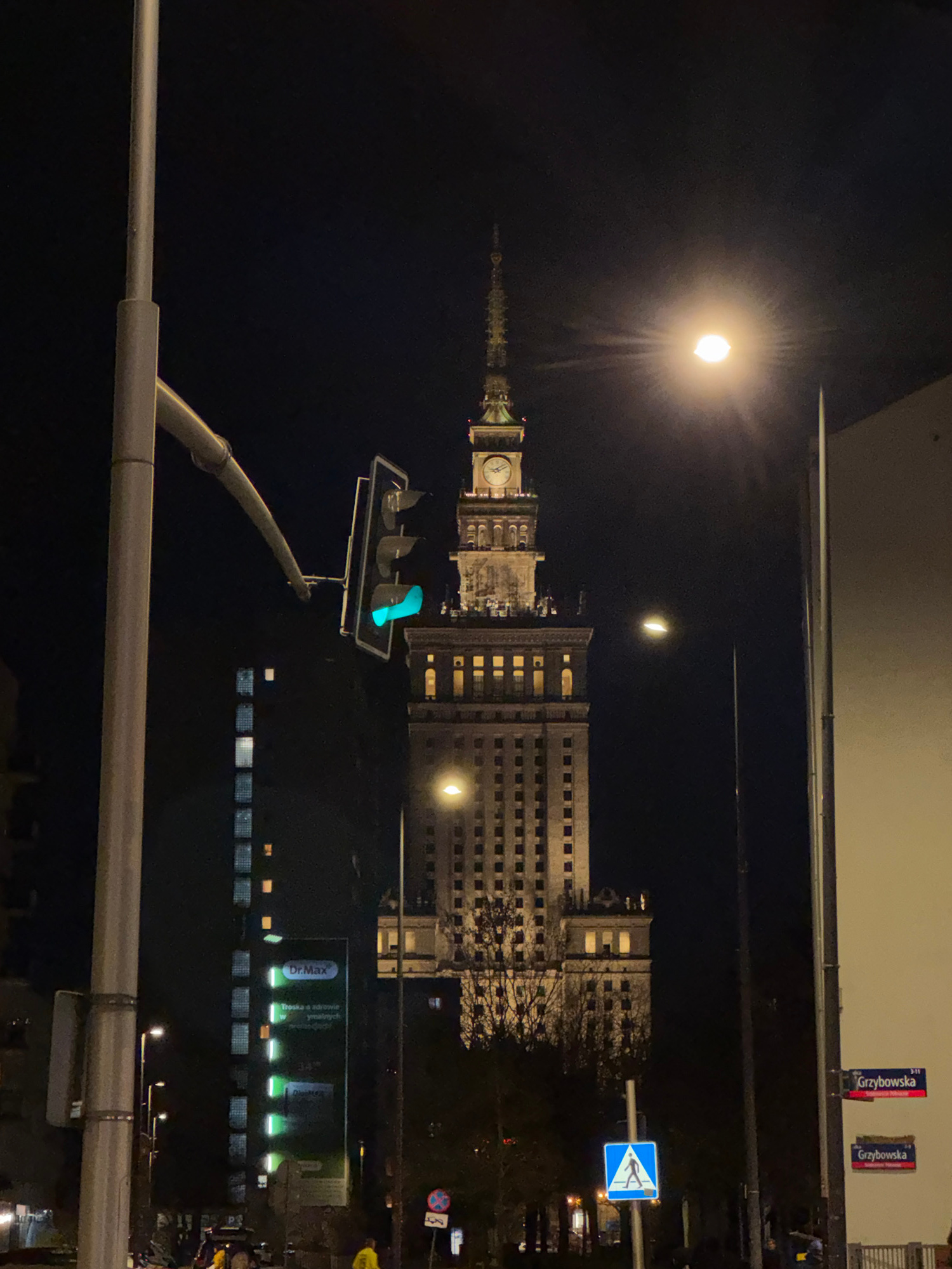 A night photograph captures the Palace of Culture and Science in Warsaw, Poland. A full moon shines brightly in the dark sky above the palace's tower and clock face. A smaller crescent moon is visible…read more