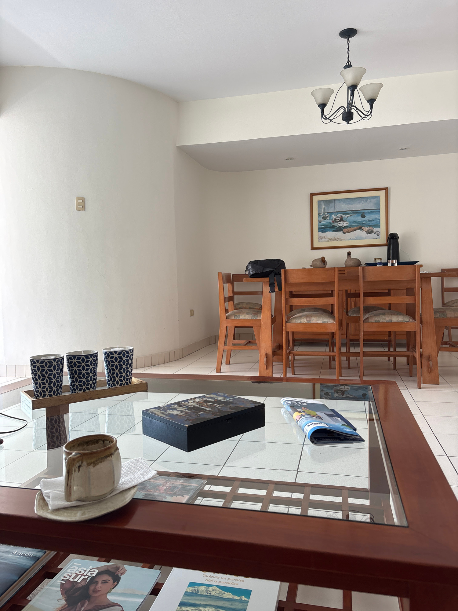 The image displays an unoccupied indoor residential living and dining area, strongly suggesting a location in Ancón, Peru, due to the presence of magazines titled "Ancon" and "Asia sur" on a lower she…read more