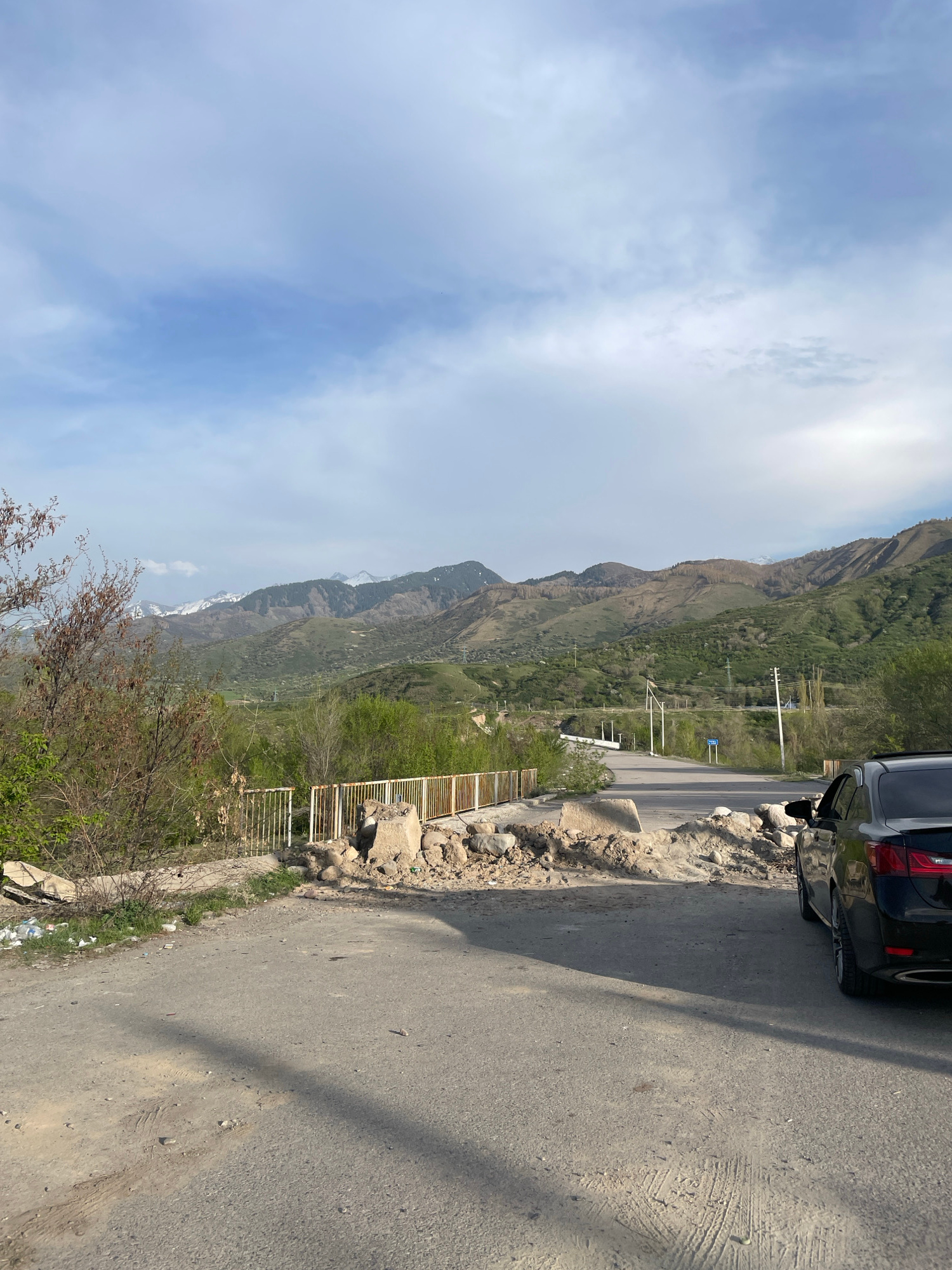 The image shows a roadside scene in what appears to be a mountainous area, likely in Talgar, Kazakhstan. A portion of a dark-colored car is visible on the right side of the frame, parked on the edge o…read more