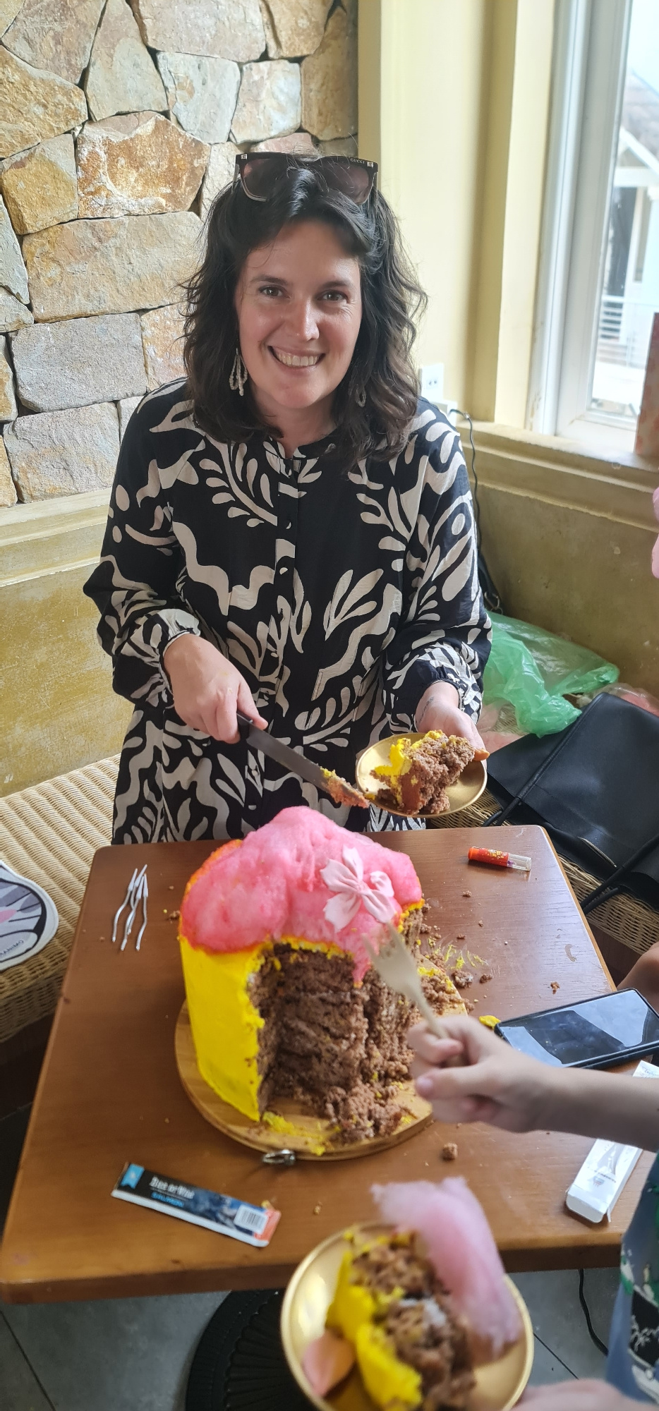 A person is cutting a cake and taking a piece of cake to a golden plate. The cake appears to be decorated with pink, yellow, and brown. One person, with shoulder-length dark hair and wearing a black a…read more