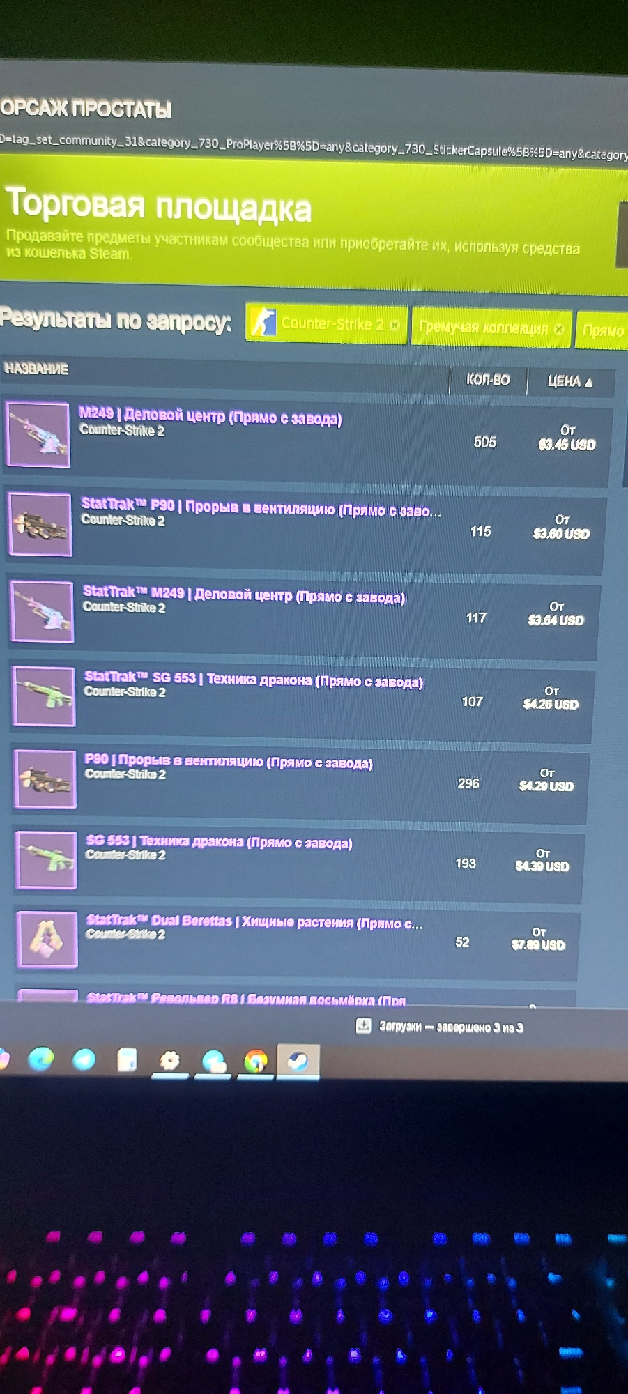 The image shows a computer screen displaying the Steam Marketplace for Counter-Strike 2. The screen lists various weapon skins for sale, including M249 | Деловой центр (Business Center), StatTrak™ P90 | Прорыв в вентиляцию (Rush in ventilation), and StatTrak™ SG 553 | Техника дракона (Dragon technology) with their prices and quantities. The screen's bottom-right corner indicates that downloads are complete. The keyboard background shows a blue and pink illumination pattern. The image location is not discernible, and no information suggests a connection to Tashkent, Uzbekistan. | Open Wire