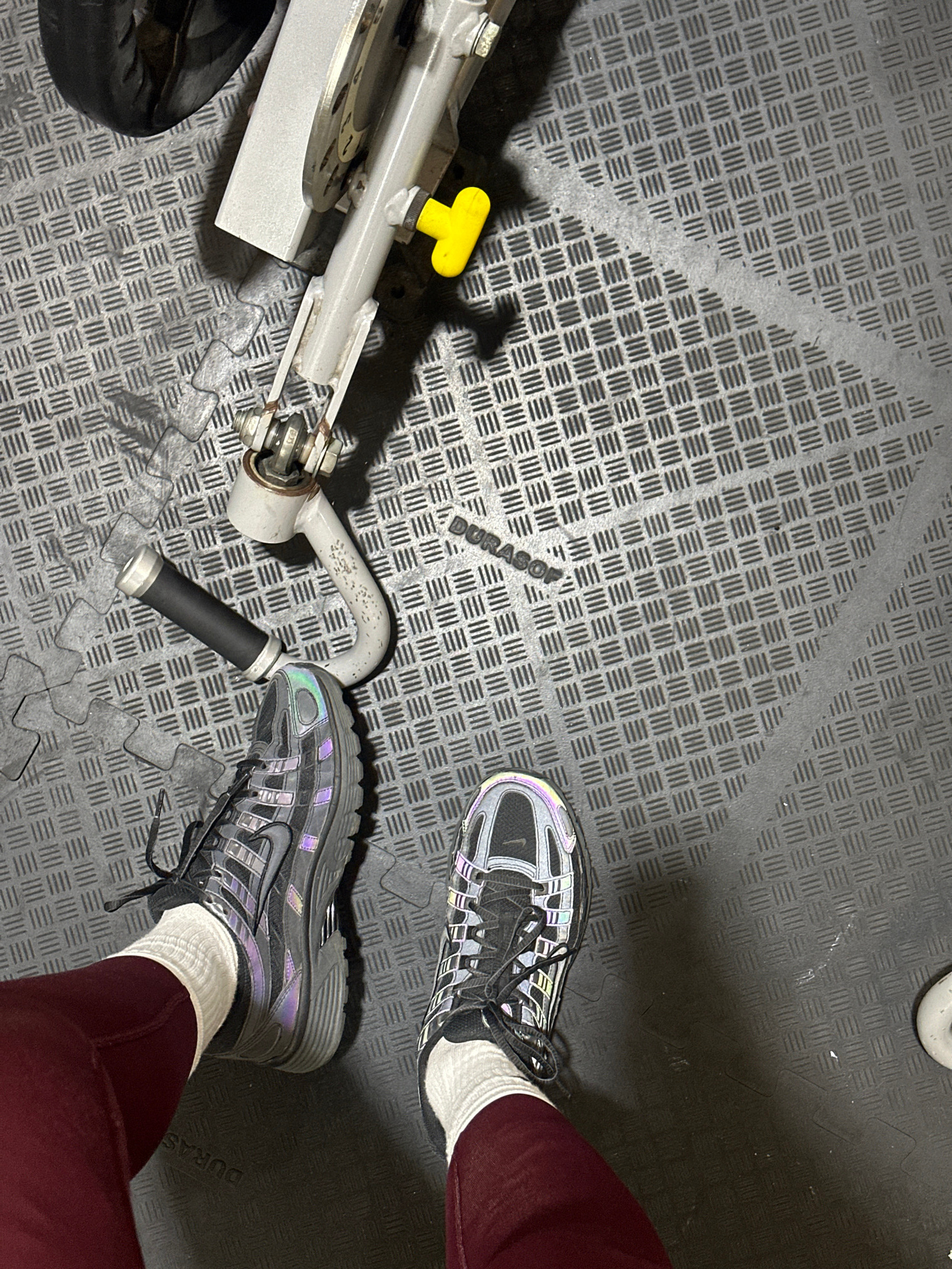The image shows a person standing on a gray, textured rubber floor, possibly in a home gym or fitness studio, as evidenced by the flooring and exercise equipment. The person is wearing burgundy leggin…read more