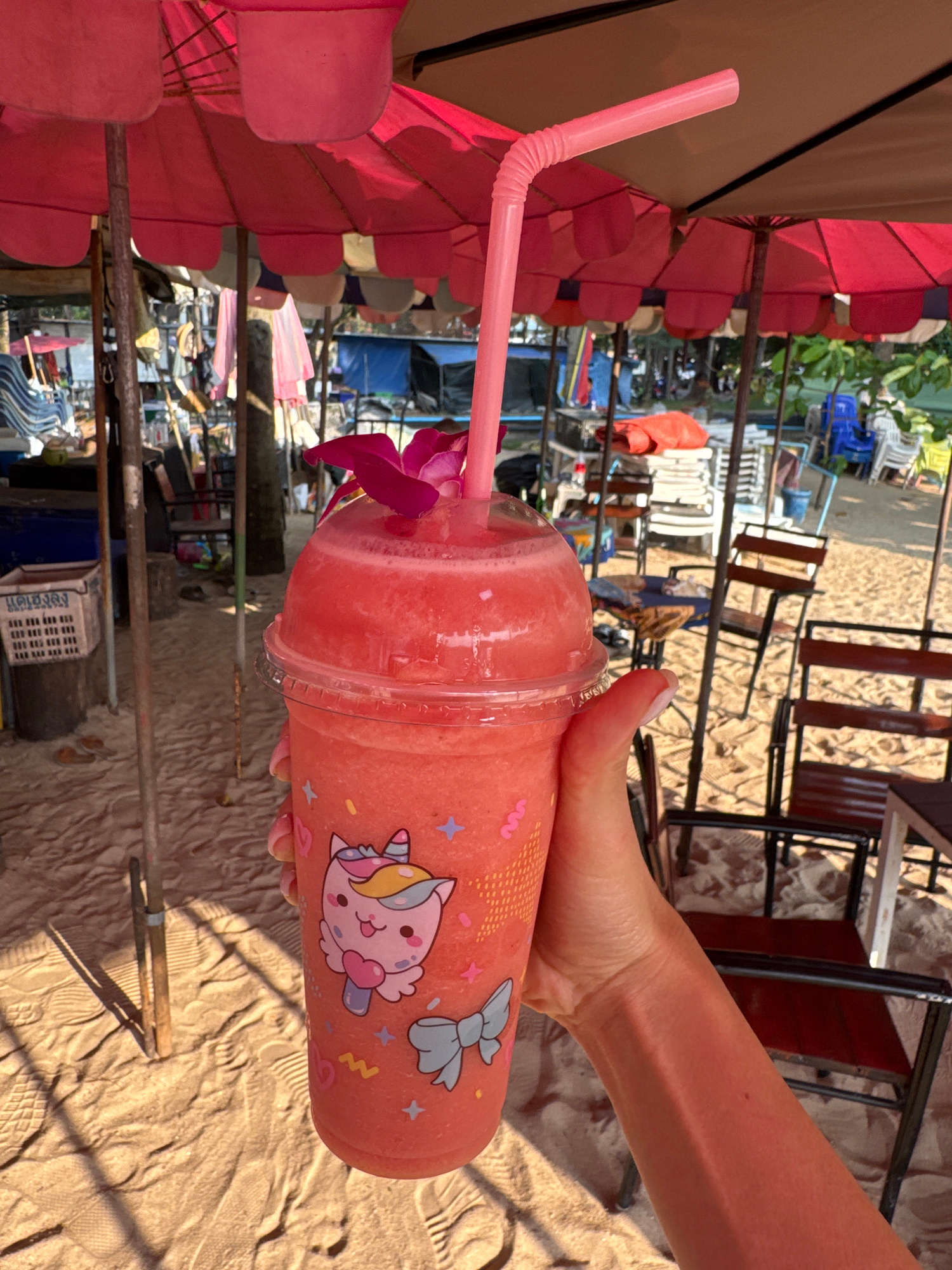 A person's right hand holds a tall, clear plastic cup containing a reddish-pink blended beverage, likely a fruit slushy, on a sandy beach in Kamala, Thailand. The beverage includes a pink bendy straw…read more
