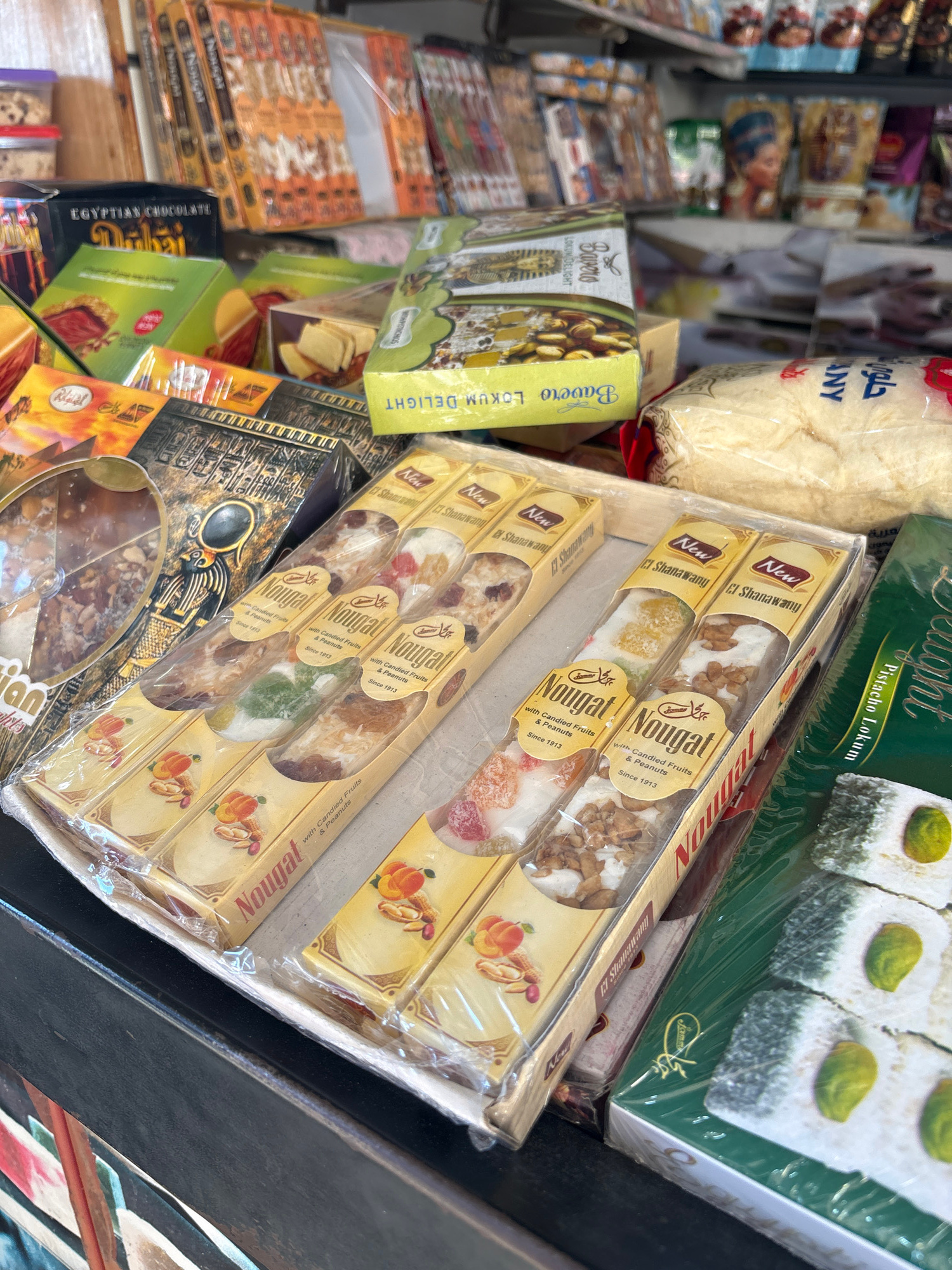The image shows a display of various sweets and confectionery items in a shop in Dahab, Egypt. On the right side are boxes of "El Shanawany Nougat with Candied Fruits & Peanuts," stacked in a cardboar…read more