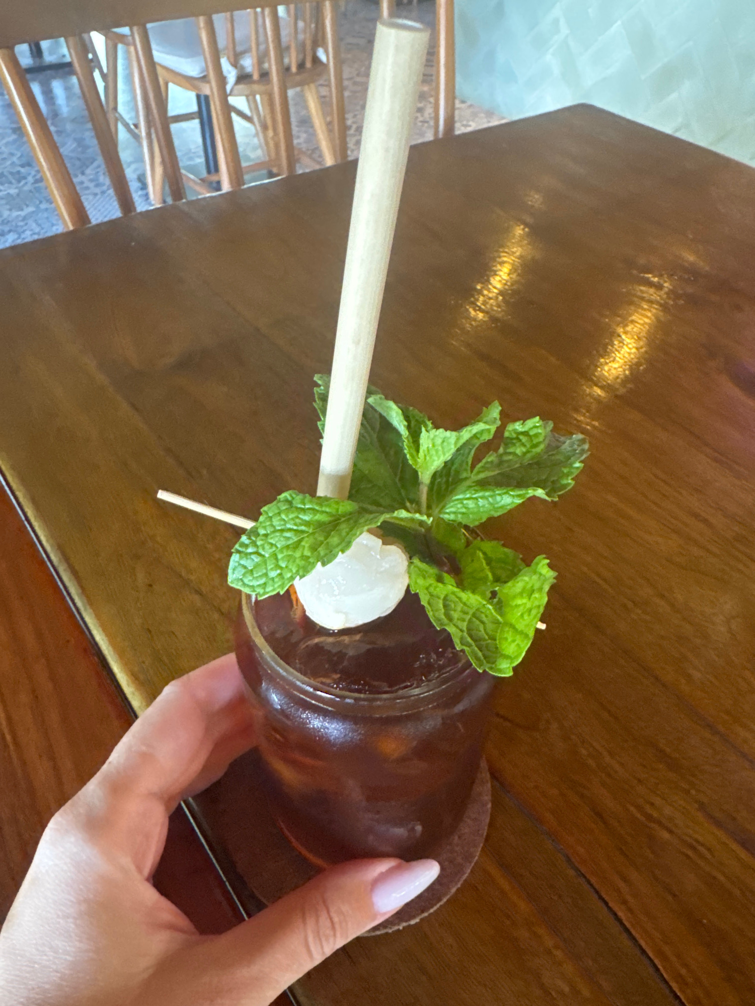 The image captures a close-up, high-angle shot of a beverage on a wooden surface. A brown-hued drink is visible, garnished with a sprig of mint and a lychee fruit, skewered by a wooden toothpick. A st…read more