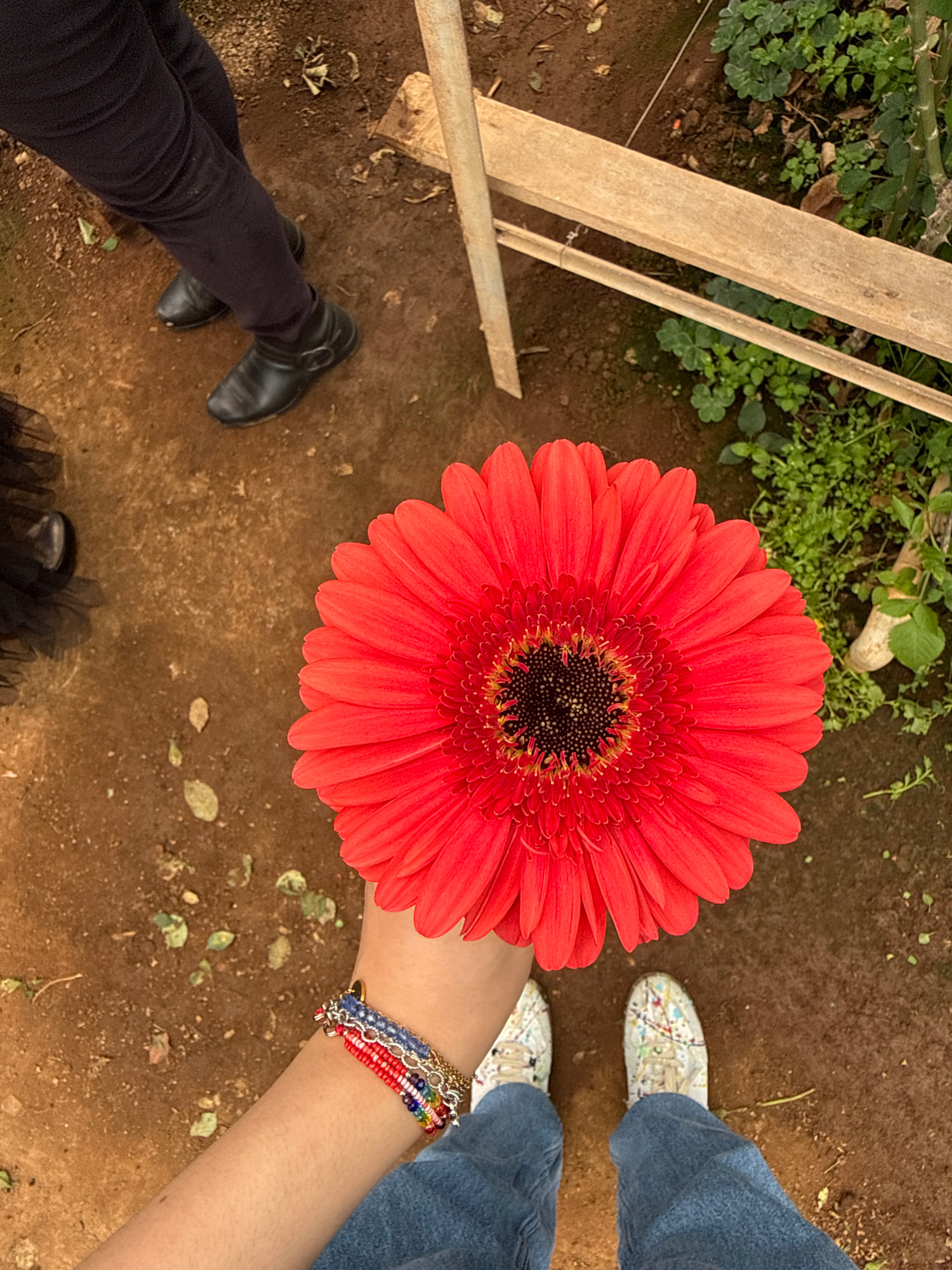 A high-angle shot shows a person holding a large, red gerbera daisy flower in their right hand. The flower is the primary focus, with a dark brown center and numerous petals. The person's arm is visib…read more