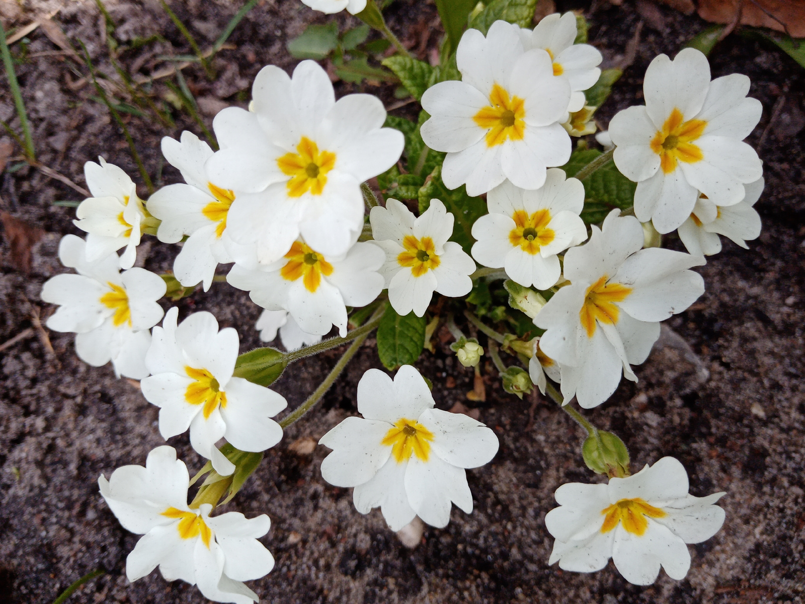 The image shows a cluster of white primrose flowers with yellow centers blooming in Elektrostal, Russia. The flowers are surrounded by soil and sparse greenery.
