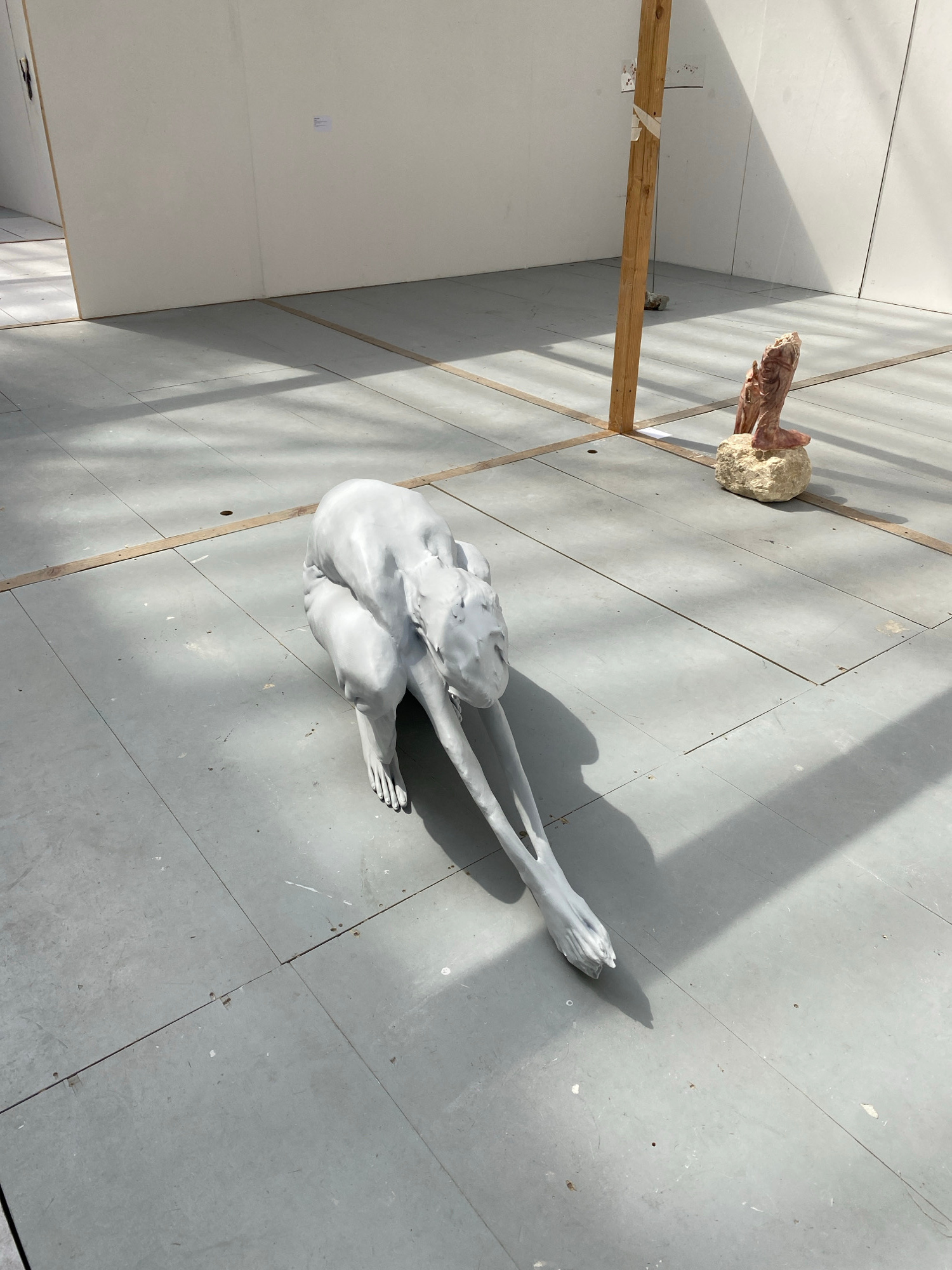 The scene is an art studio in Paris, France. Two sculptures are present on a floor consisting of large gray tiles. One sculpture is a life-size, pale gray figure of a person seated with their legs ext…read more