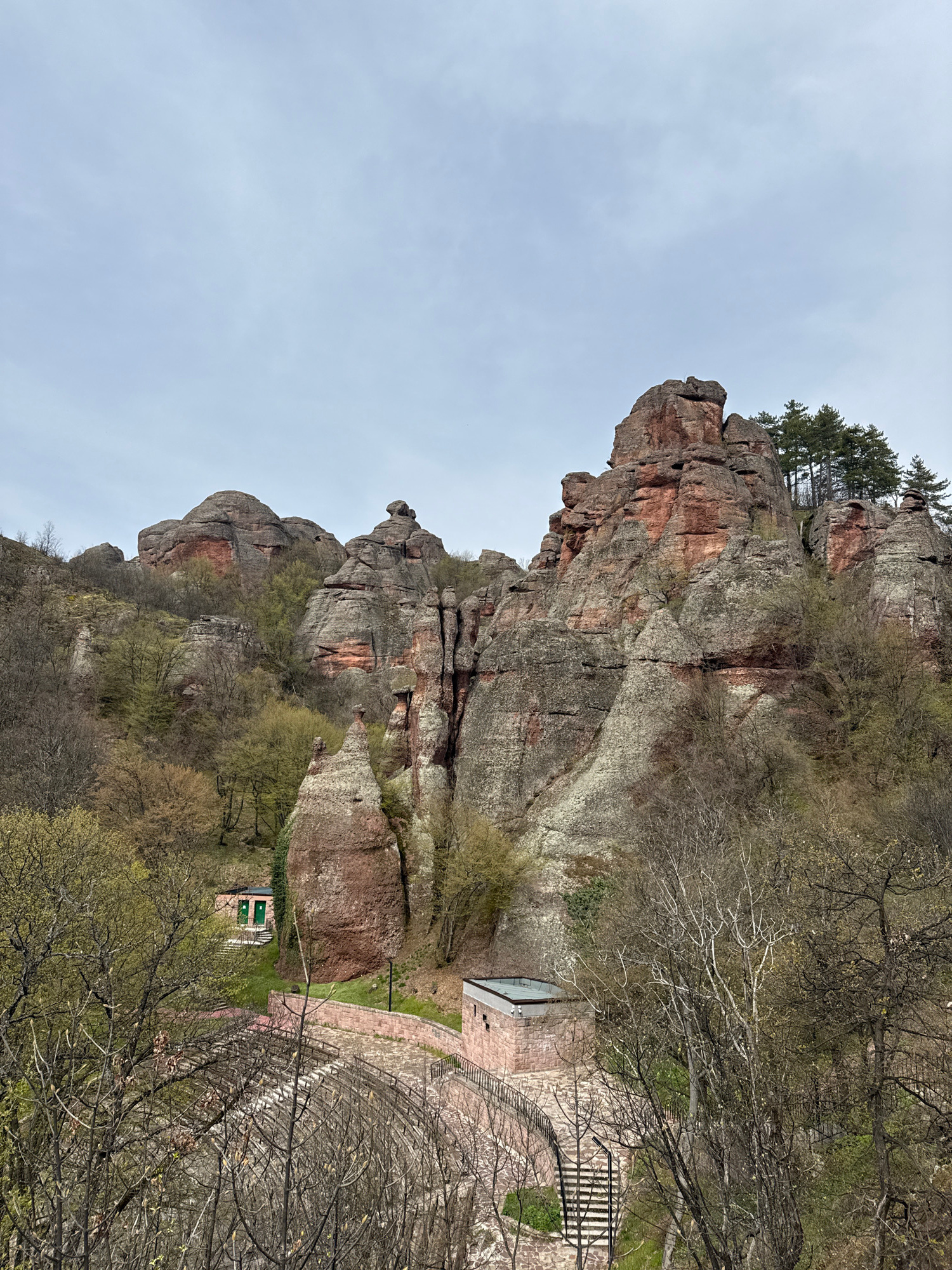 The image depicts a vertical view of the Belogradchik Rocks, a natural rock formation in the city of Belogradchik, Bulgaria. These large, reddish-brown rock formations are partially covered with sparsβ¦read more