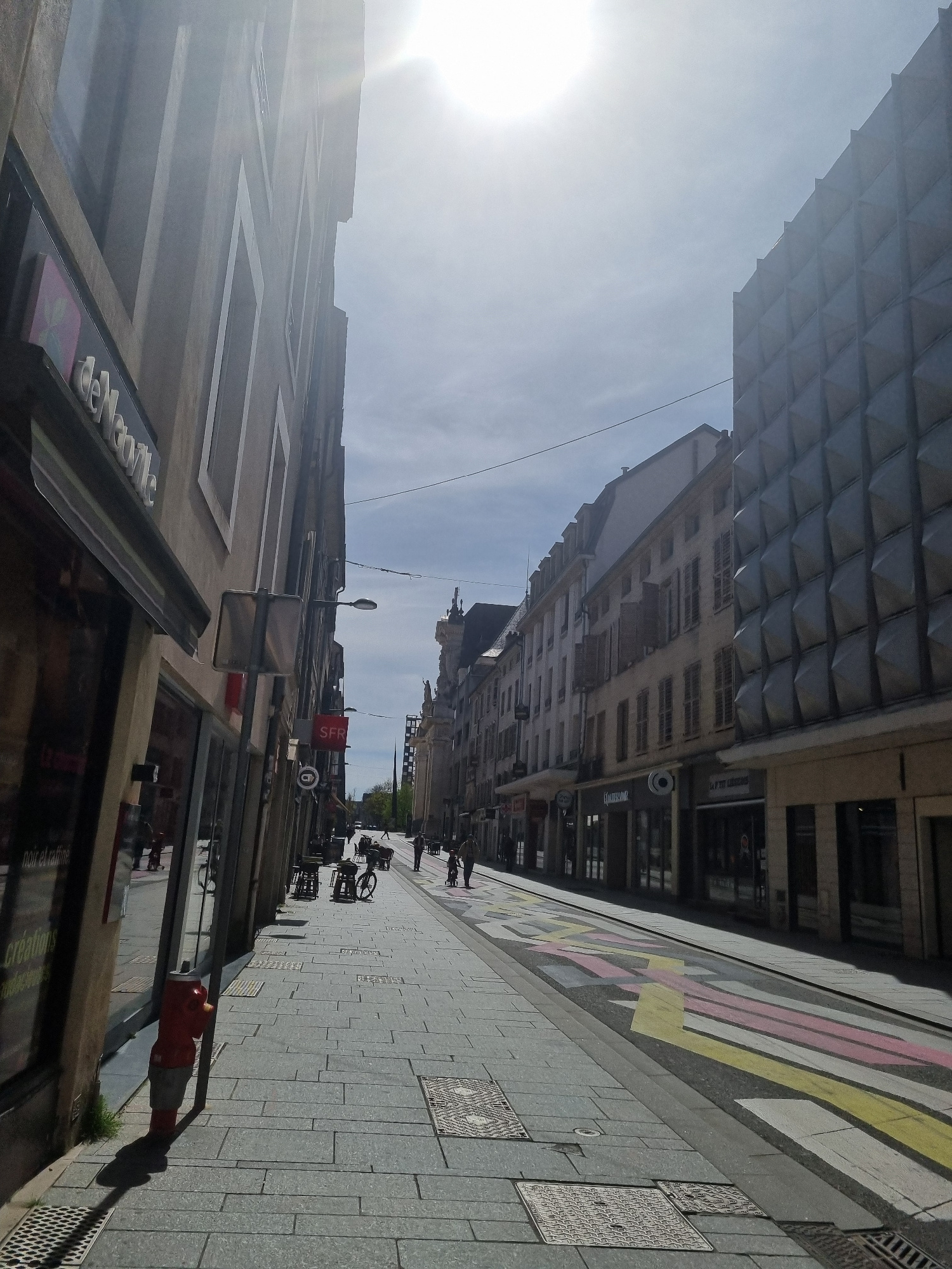Captured at street level, the image depicts a streetscape in Nancy, France, under a bright, sunlit sky. The sun's glare dominates the left portion of the frame, shining down the street. The street isβ¦read more
