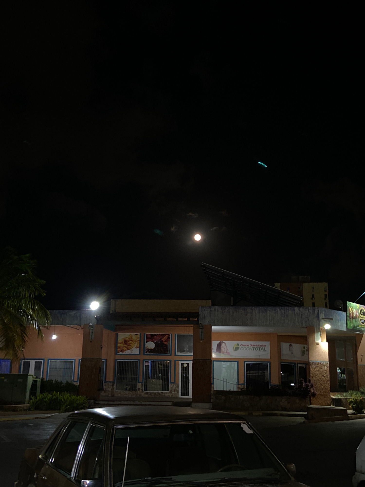 The image depicts a night scene in Juan Griego, Venezuela. A multi-story building with a sign for "Clinicas Odontologicas ODONTOTAL" is illuminated by streetlights. The moon is visible in the dark sky…read more