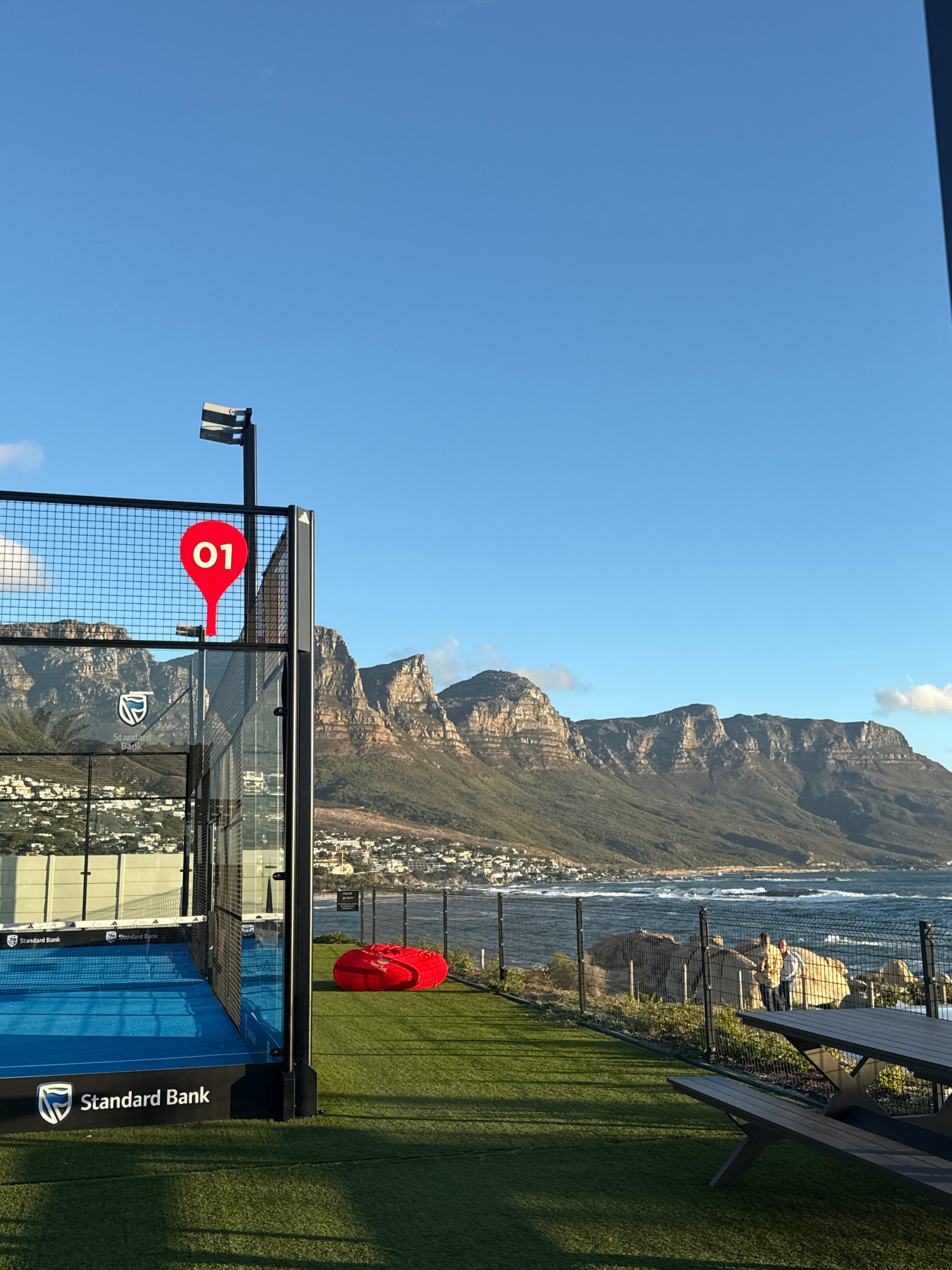 A clear day in Cape Town, South Africa, features a padel tennis court overlooking the Atlantic Ocean. The court, branded with "Standard Bank," has blue flooring and black fencing with a red paddle-sha…read more