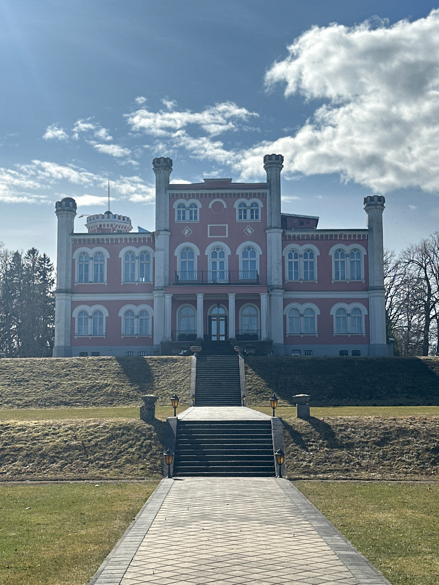 The image captures a vertical view of the Bīriņi Castle in Latvia. The castle has a distinct pink facade with white trim, featuring multiple floors and cylindrical towers topped with crenellations. Th…read more