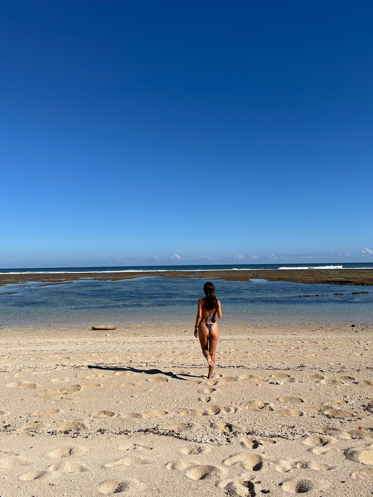This image, when correctly oriented, portrays a serene beach scene bathed in bright sunlight in Kuta Selatan, Indonesia. The dominant subject is a person, appearing to be a woman with long dark hair,…read more
