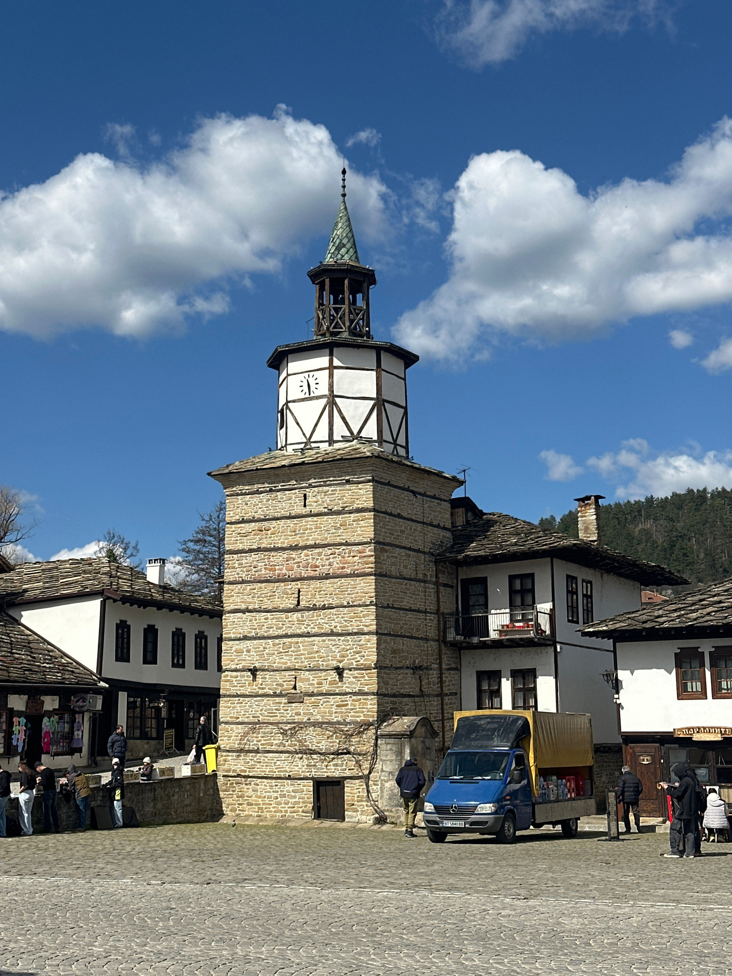 The image depicts the clock tower in the city of Tryavna, Bulgaria. The tower is constructed of stone and wood, with a clock face visible. The sky is blue with white clouds. Adjacent to the tower are…read more