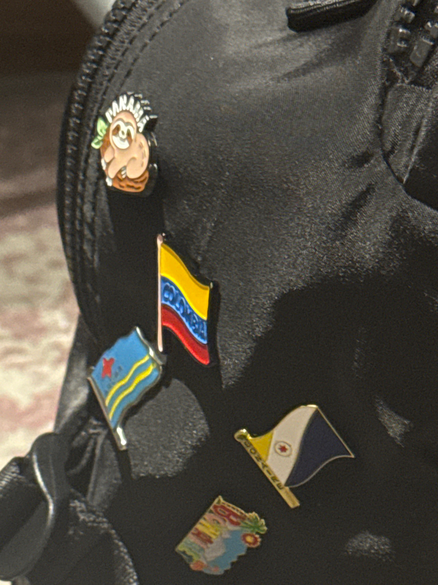 The image shows a close-up of a black nylon bag or backpack, adorned with several decorative pins. The pins include flags representing Bonaire, Colombia, and possibly another Caribbean island based on…read more