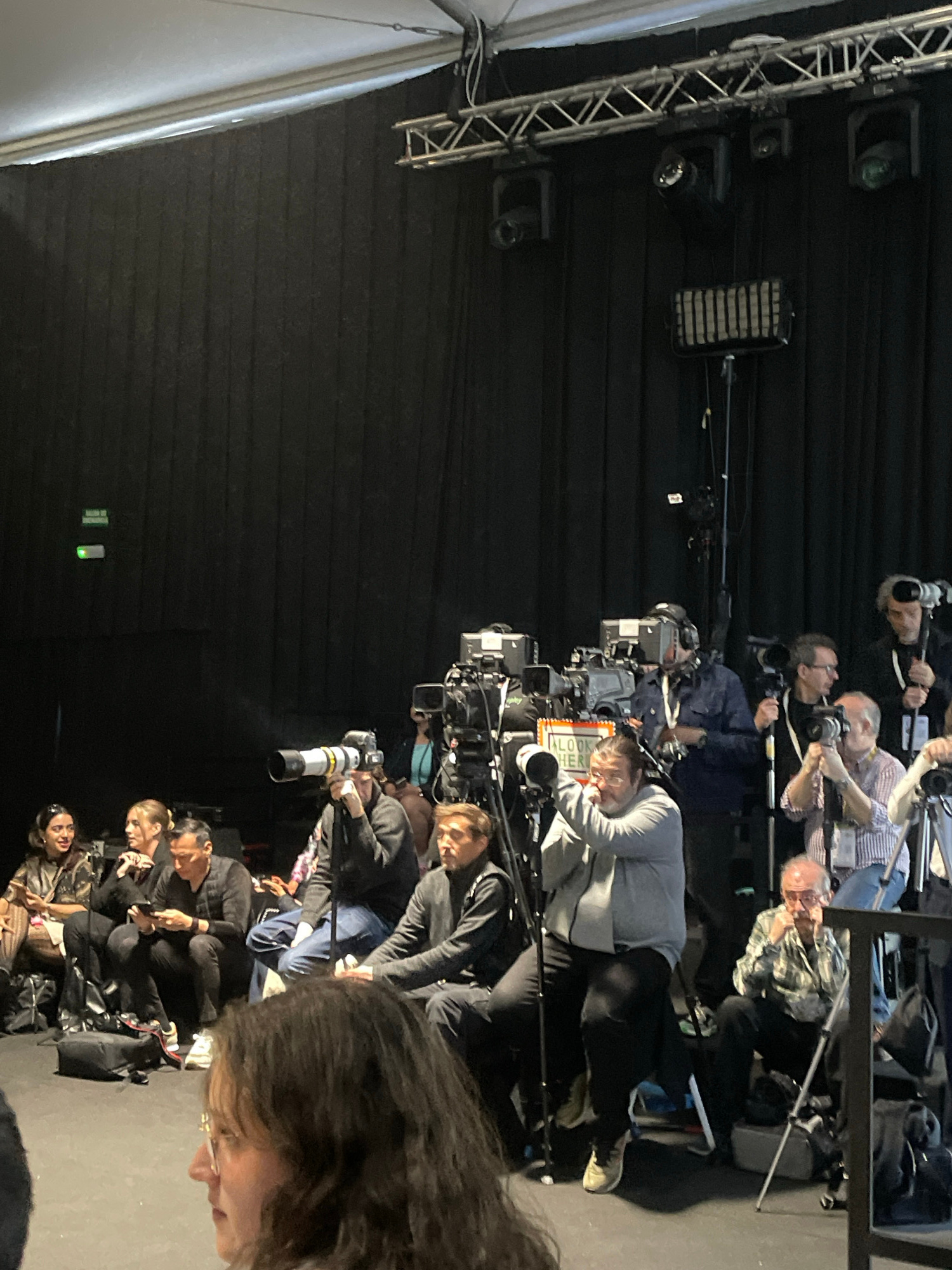 The image depicts a group of people, possibly photographers or camera operators, positioned in rows with their equipment. The scene appears to be indoors, likely in a media or press area. The backgrou…read more