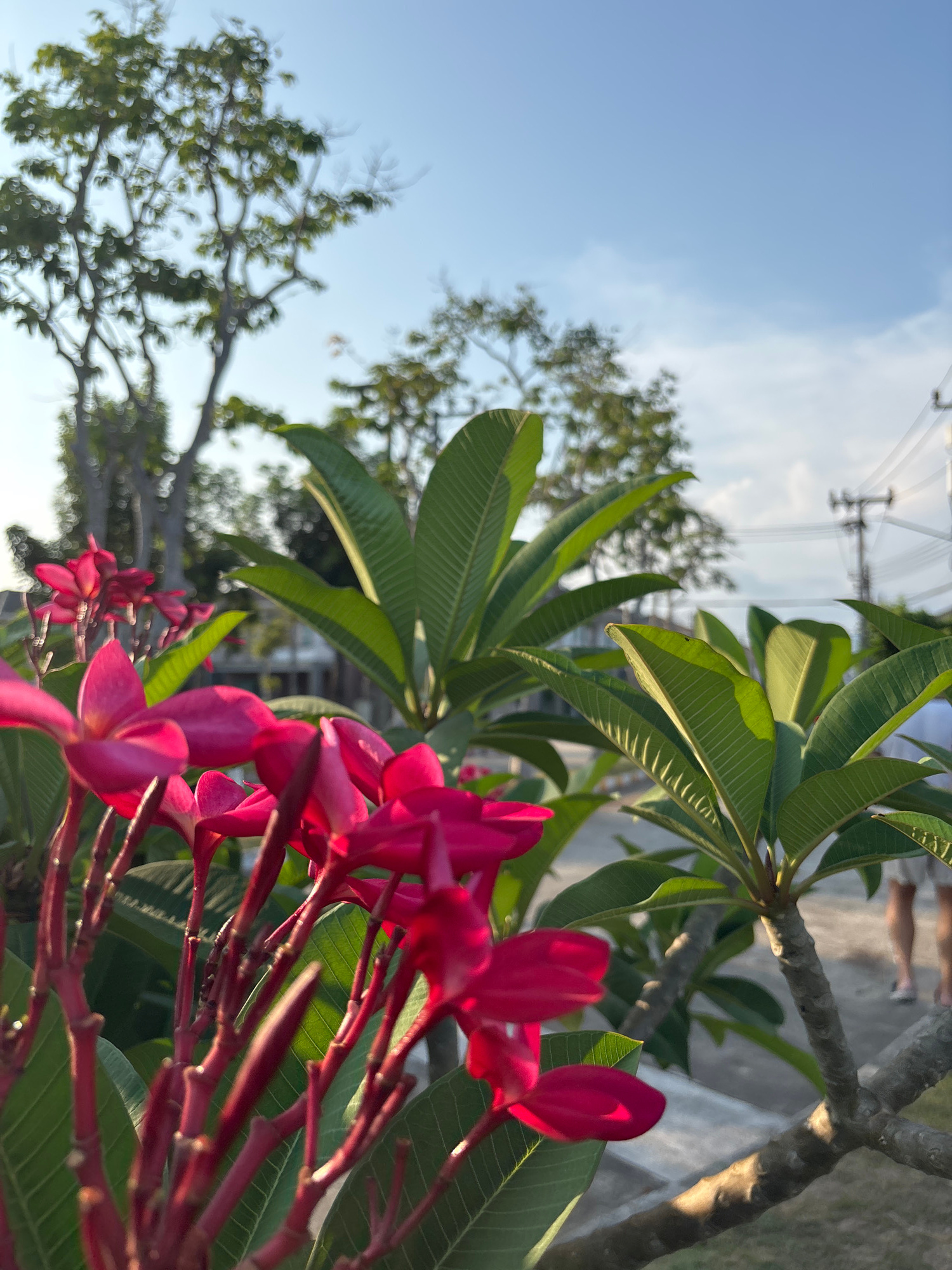 The image captures a close-up of red frangipani flowers and green leaves against a backdrop of a blue sky and blurred trees. Utility poles are also visible in the background. The location is likely Ko…read more
