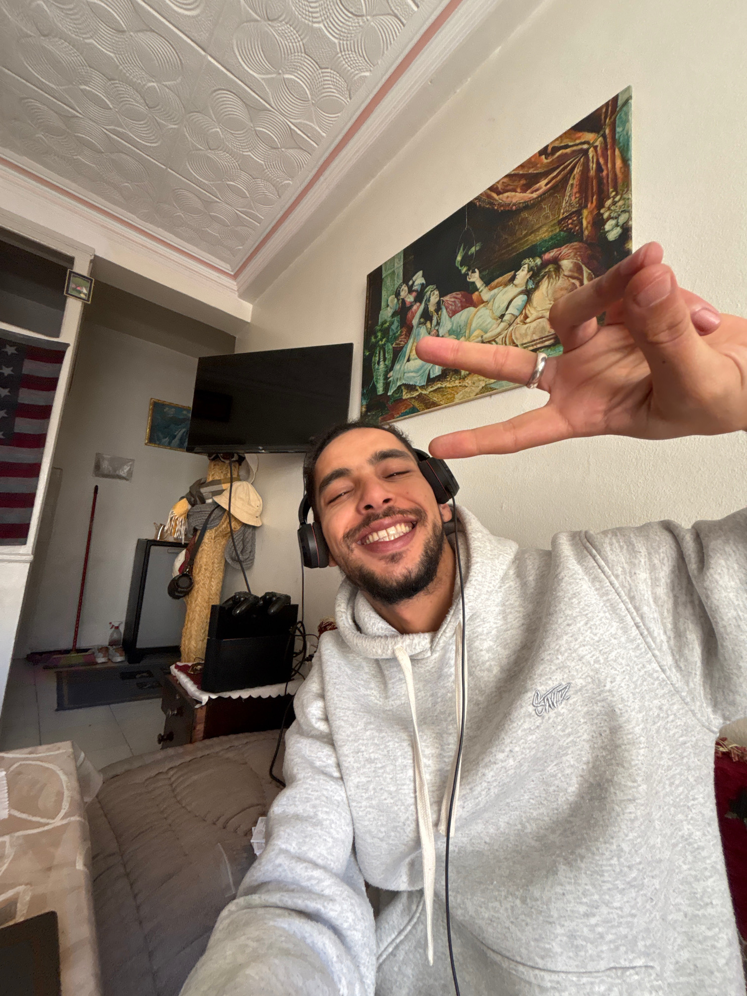 The image captures a selfie of a young adult male indoors in Tanger, Morocco. The subject, a male with dark hair, a beard, and a mustache, is smiling broadly, showing his teeth. He is wearing a light…read more
