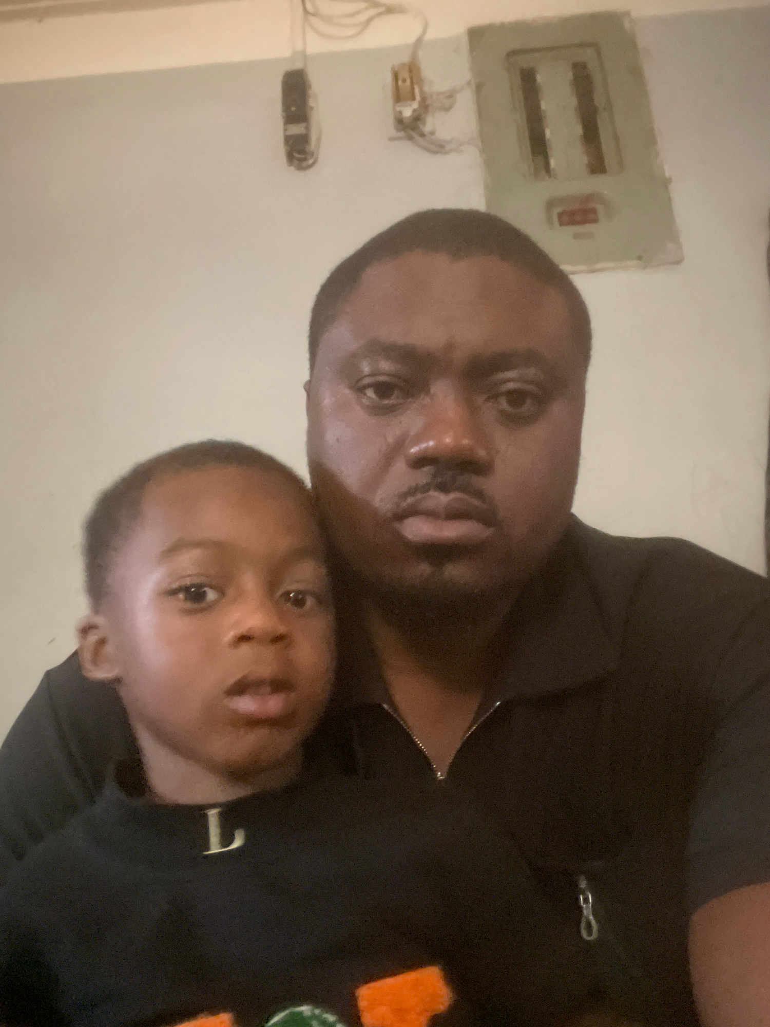 A selfie captures an adult male and a young child posing closely together. The man has dark skin, short dark hair, and a closely-trimmed beard. He is wearing a dark, collared shirt. The child, with a…read more