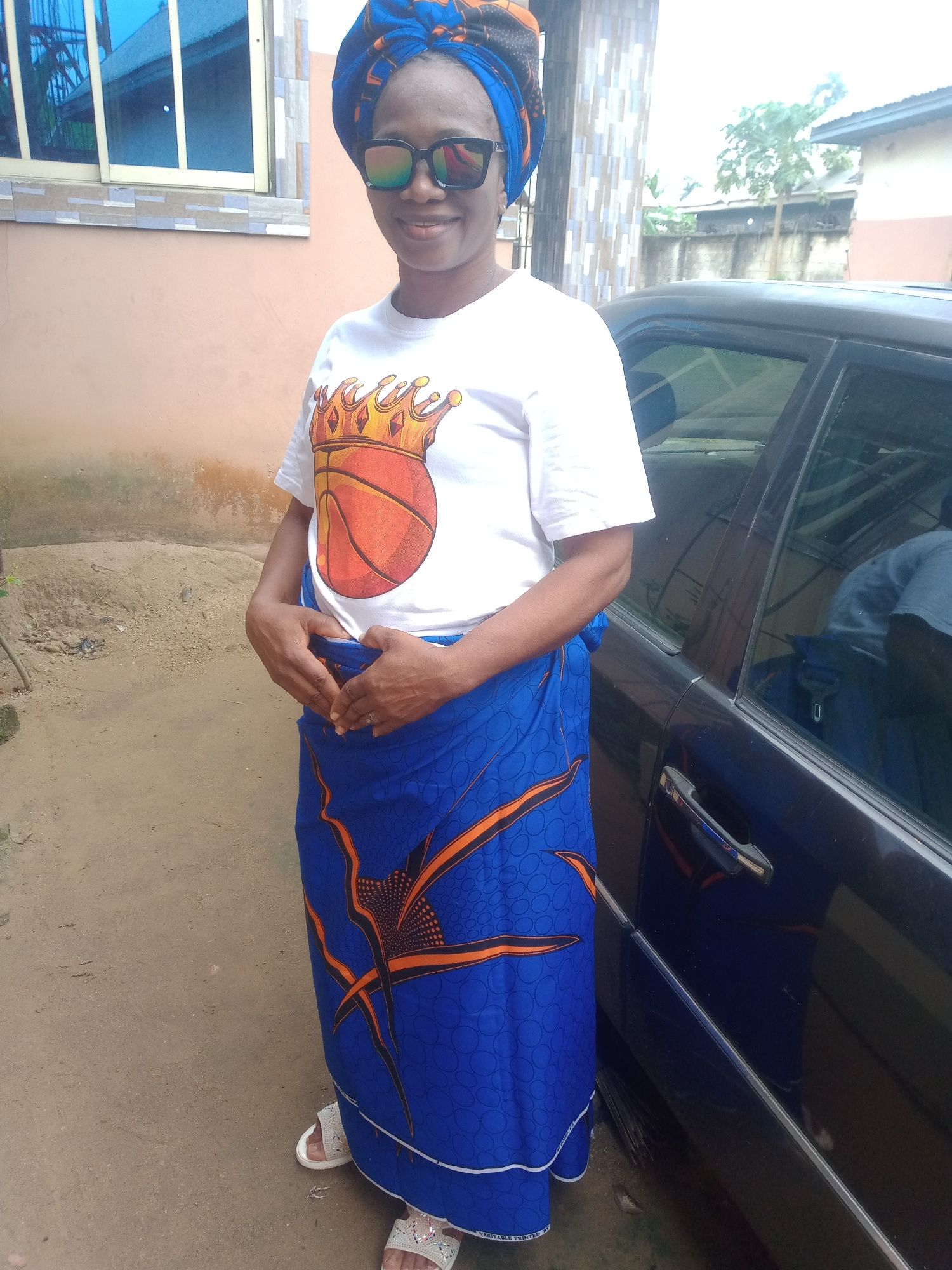 A woman stands outdoors in Obehie, Nigeria, facing the camera with a warm smile. She is wearing a vibrant blue, orange, and black patterned headwrap, complemented by mirrored sunglasses. Her attire inβ¦read more