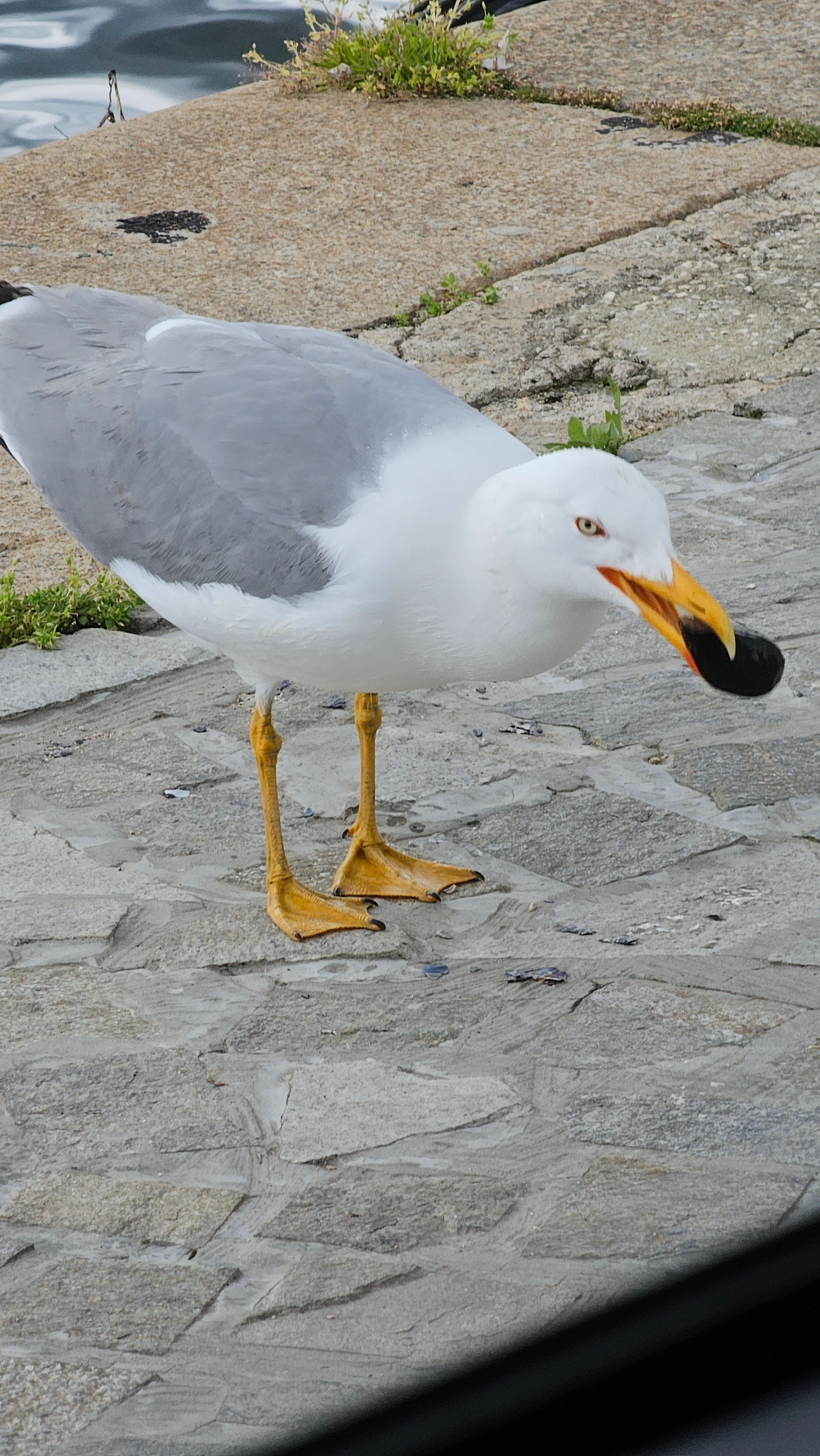 The image depicts a Yellow-legged gull (Larus michahellis) standing on a stone surface, likely part of a promenade or pier. The gull has a white head and body with gray wings. Its bill is bright yello…read more