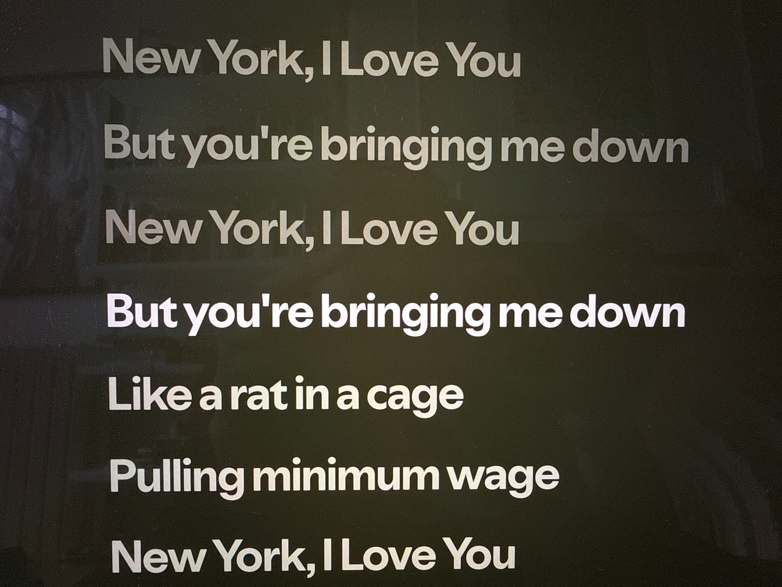 The image displays a digital screen in a New York City subway station, United States of America, showing white text against a dark grey or black background. The text consists of lines from the song "N…read more