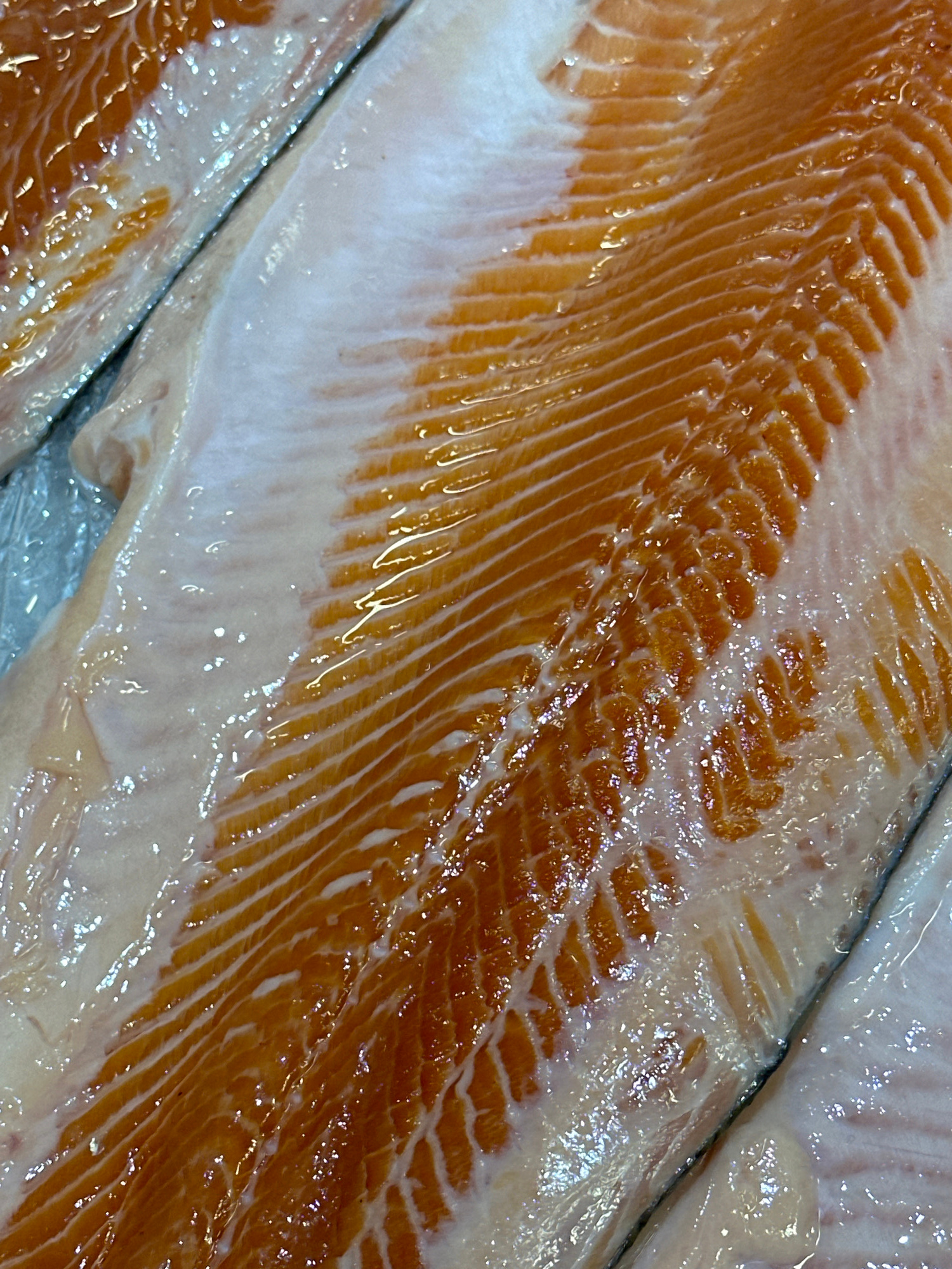 A close-up shot depicts raw salmon fillets, showing the characteristic reddish-orange flesh and white connective tissue. The fillets appear shiny and wet, likely due to natural oils or a glaze. The co…read more